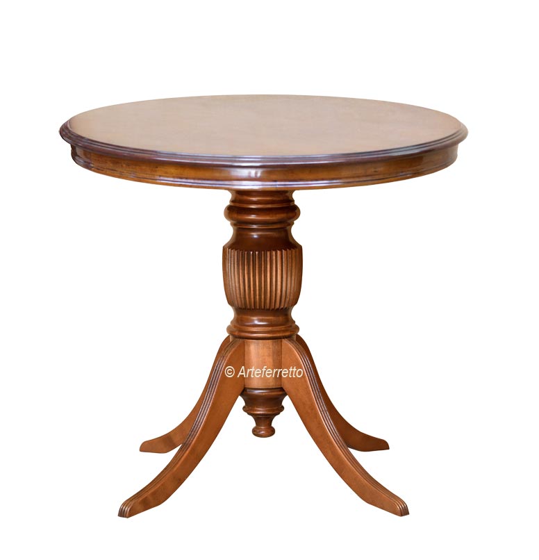 Die massive runde Platte wird von einem zentralen Bein getragen, auf dem die feinen vertikalen Schnitzereien hervorstechen. Das zentrale Bein aus Massivholz verzweigt sich in vier elegante Stützbeine, die die Schnitzereien am oberen Teil des Beins aufgreifen.
