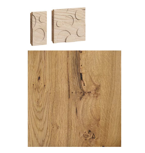 Aschgraue Griffe aus Massivholz mit geschnitztem Kreismuster.