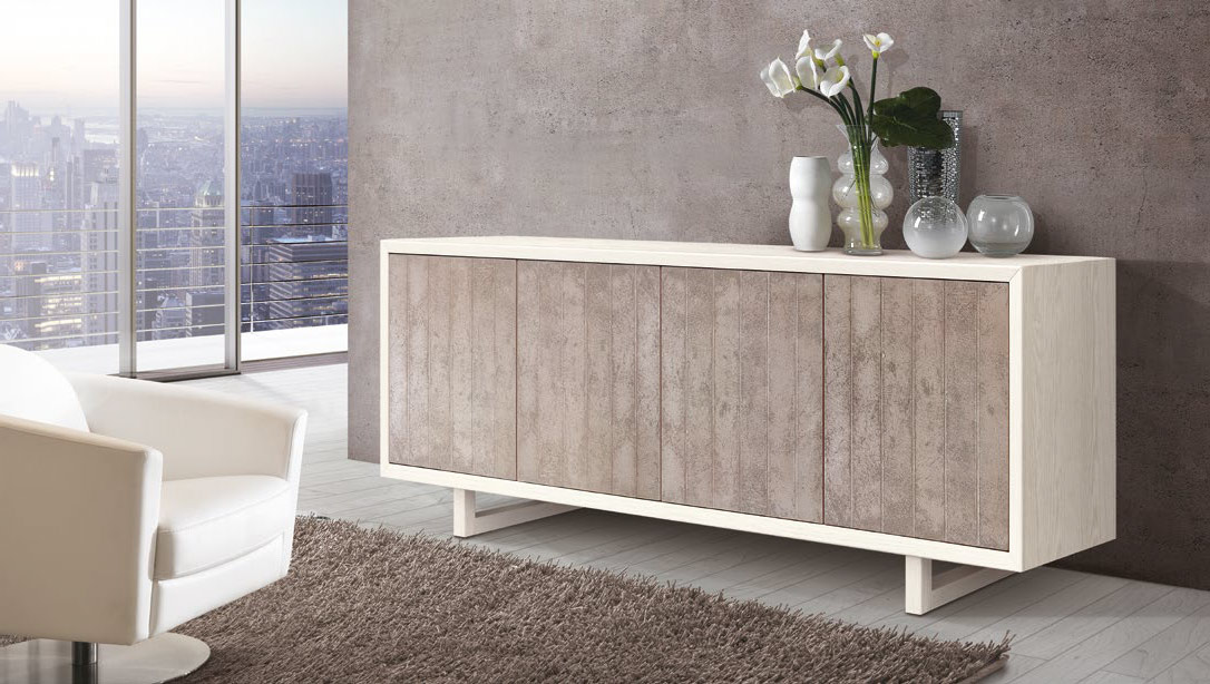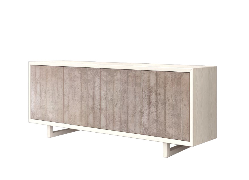 Made in Italy Möbel aus Eschenholz. Struktur mit einfachen Linien in weiß lackiert. 4 Türen mit spezieller Ausführung "gestreiftem Betoneffekt" und praktischem Push-Pull-Öffnungssystem.