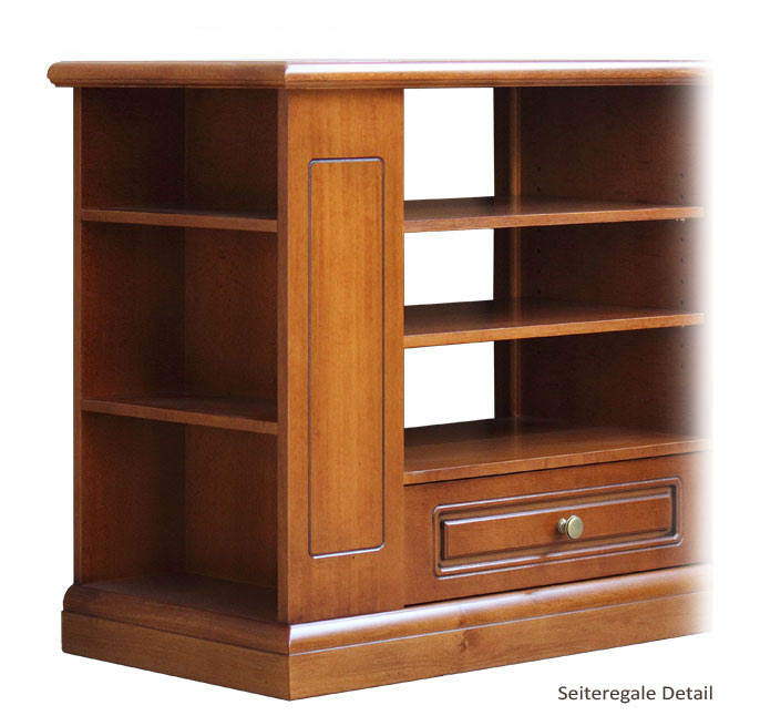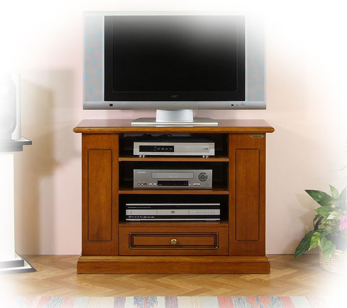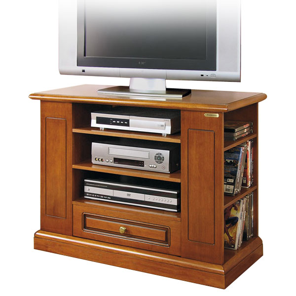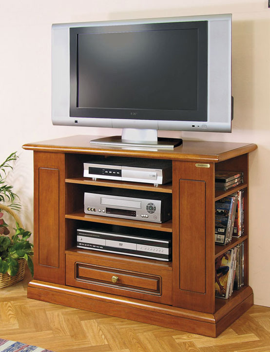 Im Zentrum hat es drei offene Fächer mit höhenverstellbaren Einlegeböden für die Fernseher-Ausrüstung, z.B. CD Leser, Decoder, Home Theater, etc. Dieses Möbel hat eine geräumige Schublade.