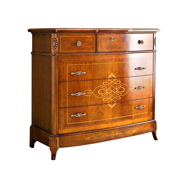 Eine außergewöhnliche Kommode mit hervorragender Verarbeitung, deren Front mit einer Intarsie von seltener Schönheit verziert ist.