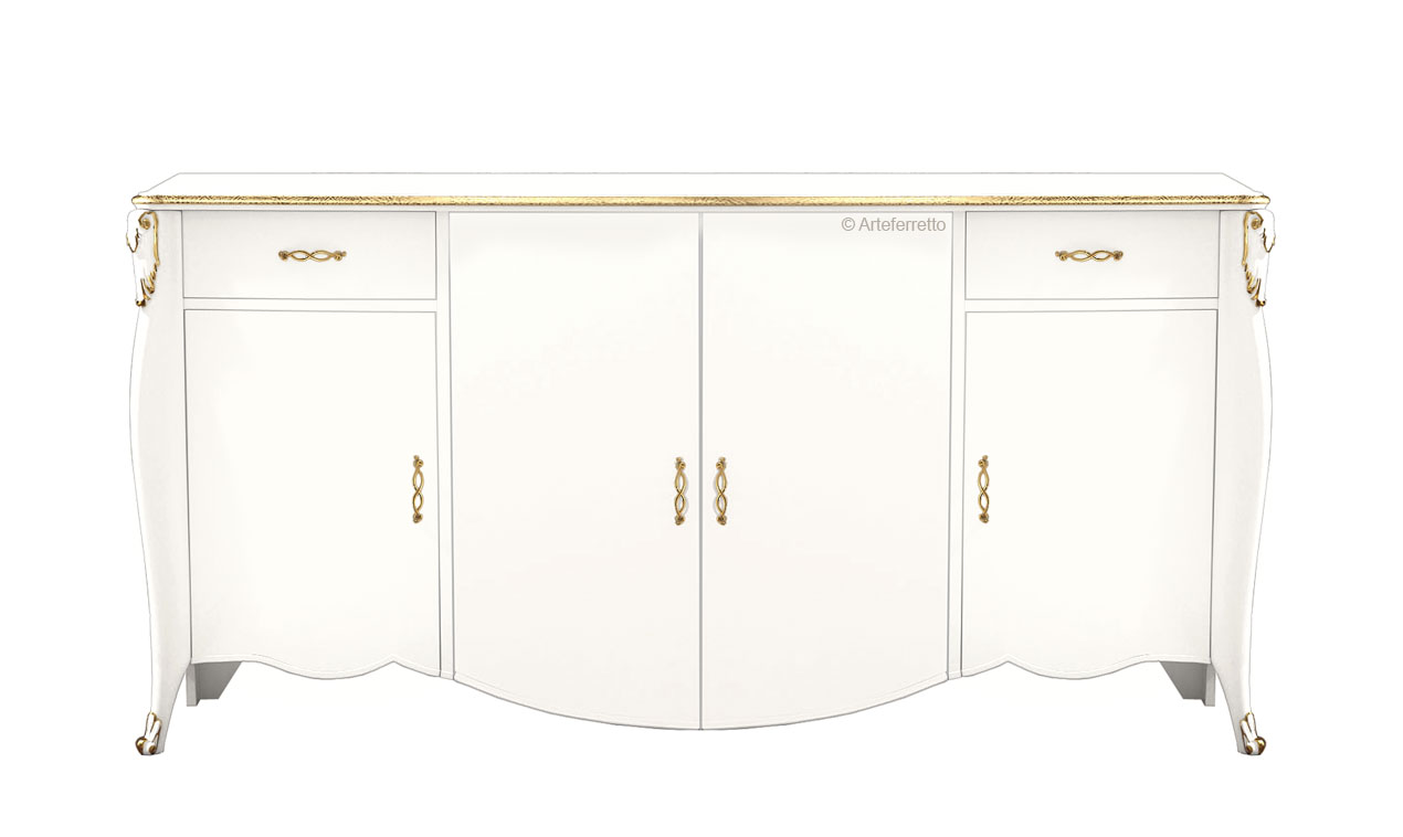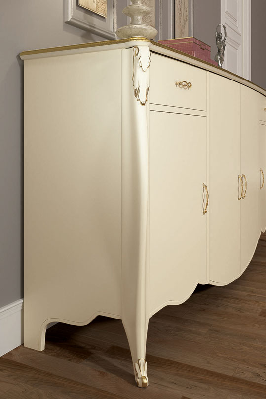 Glatte Oberflächen, die auf geschwungenen, zarten Formen basieren, werden durch stilvolle Details wie raffinierte Schnitzereien und feine Griffe ergänzt.