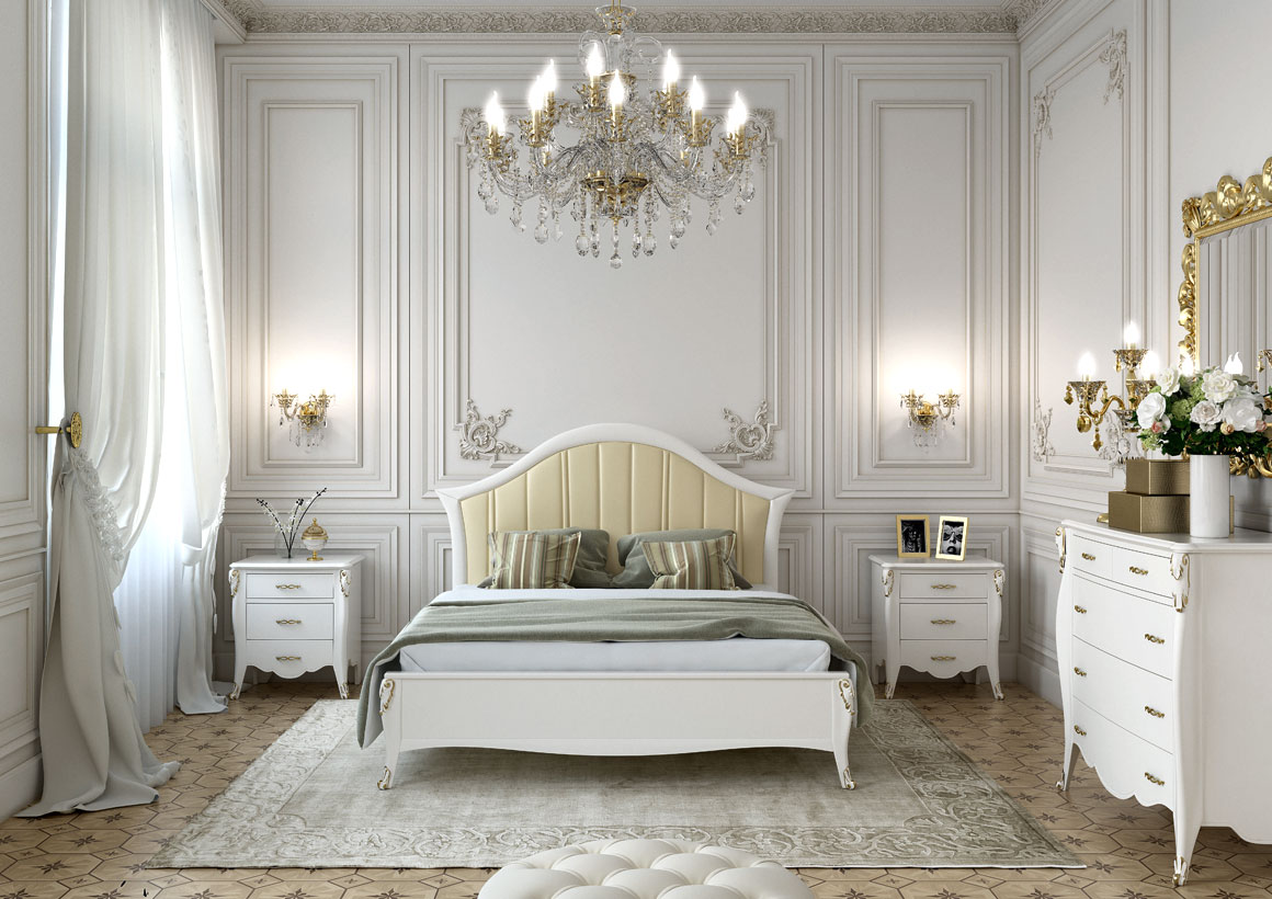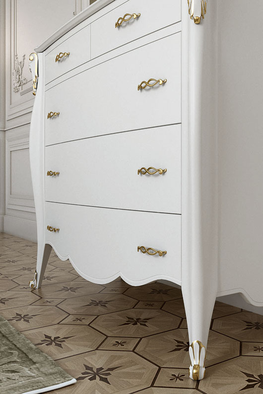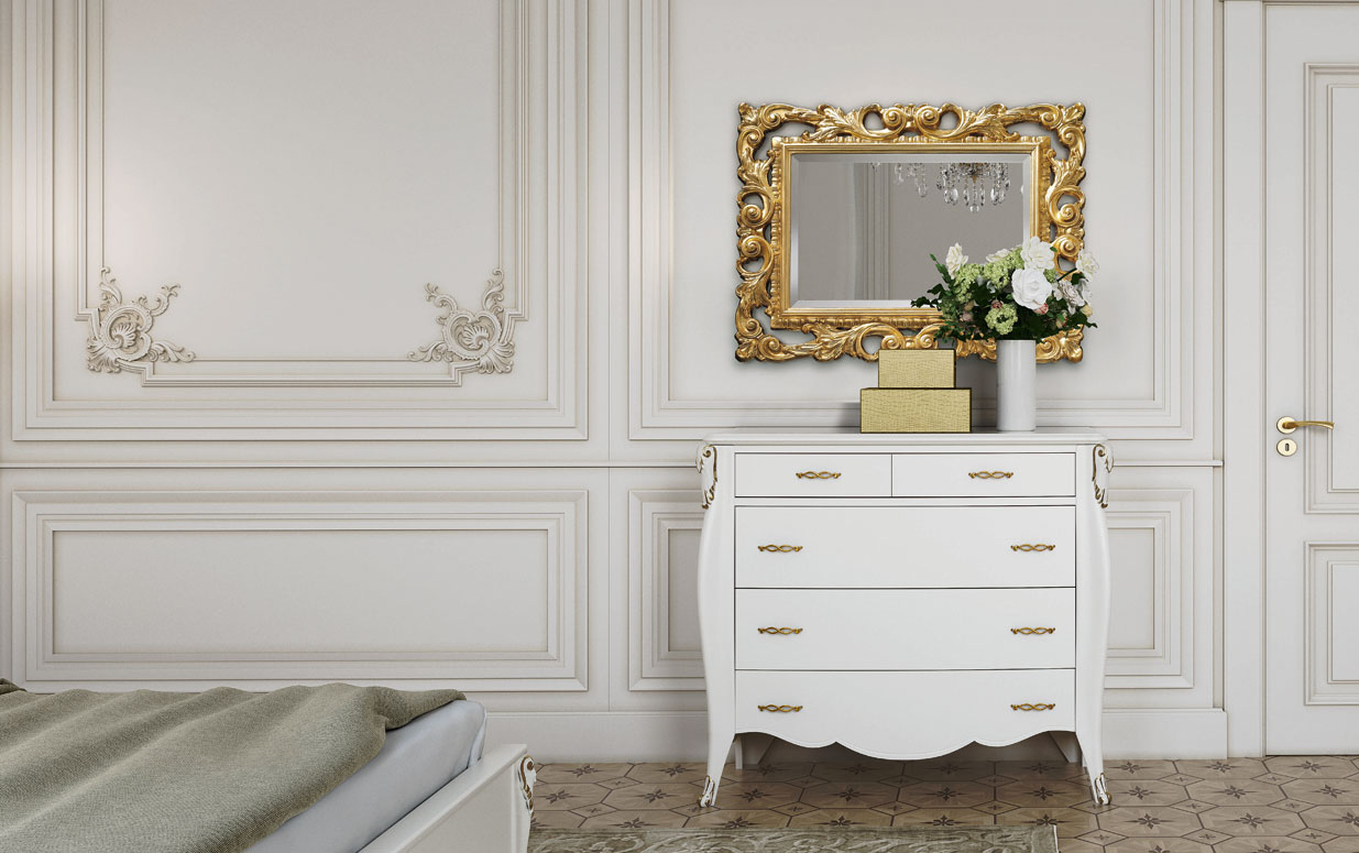 Das Möbel passt gut im Schlafzimmer in Kombination mit einem Spiegel mit klassischer Konnotation.