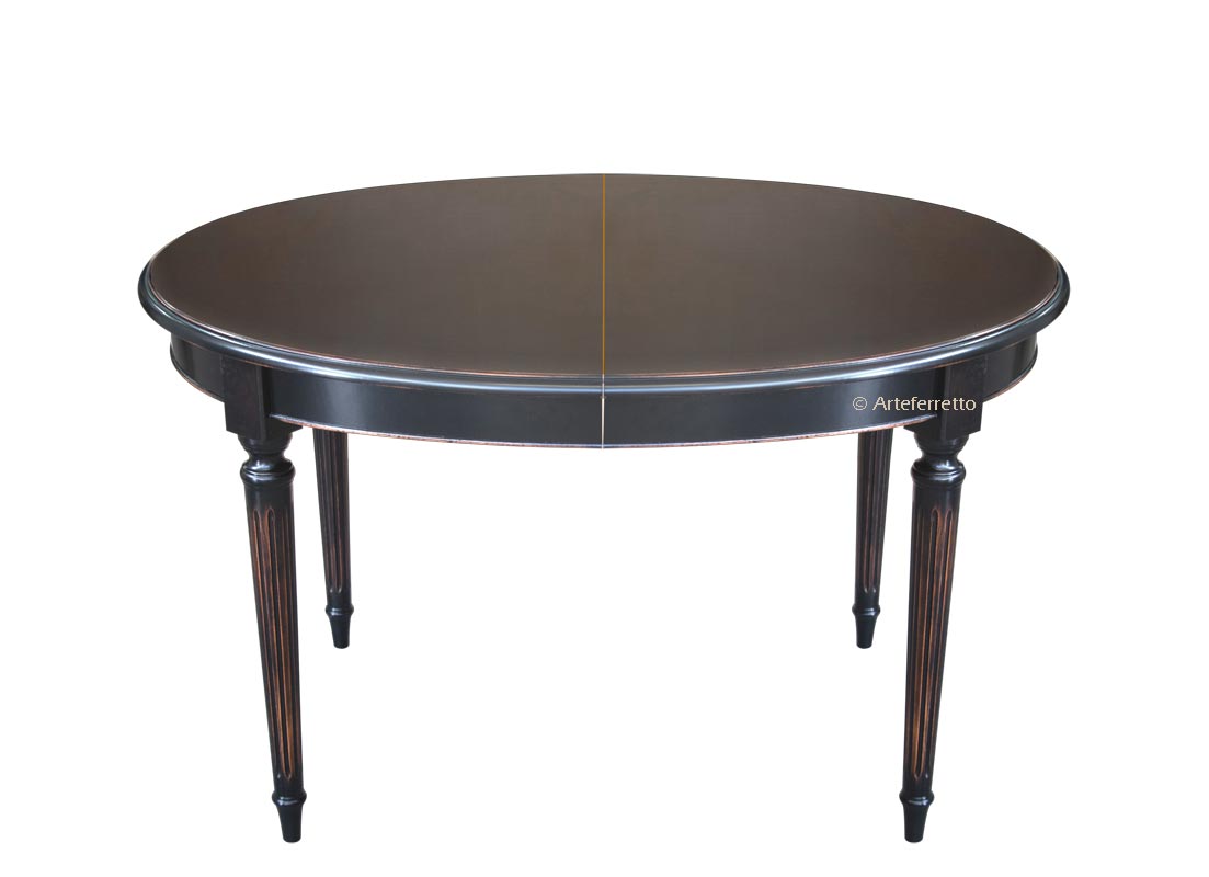 Ein sehr eleganter ovaler Tisch im "Empire-Stil", der zusätzlich zu seinem sehr raffinierten Aussehen den Komfort von zwei 40 cm langen Verlängerungen bietet, die es ermöglichen, eine 210 cm lange Platte zu erhalten, während in der nicht verlängerten Konfiguration der beanspruchte Raum sehr begrenzt ist (130 x 95 cm).
