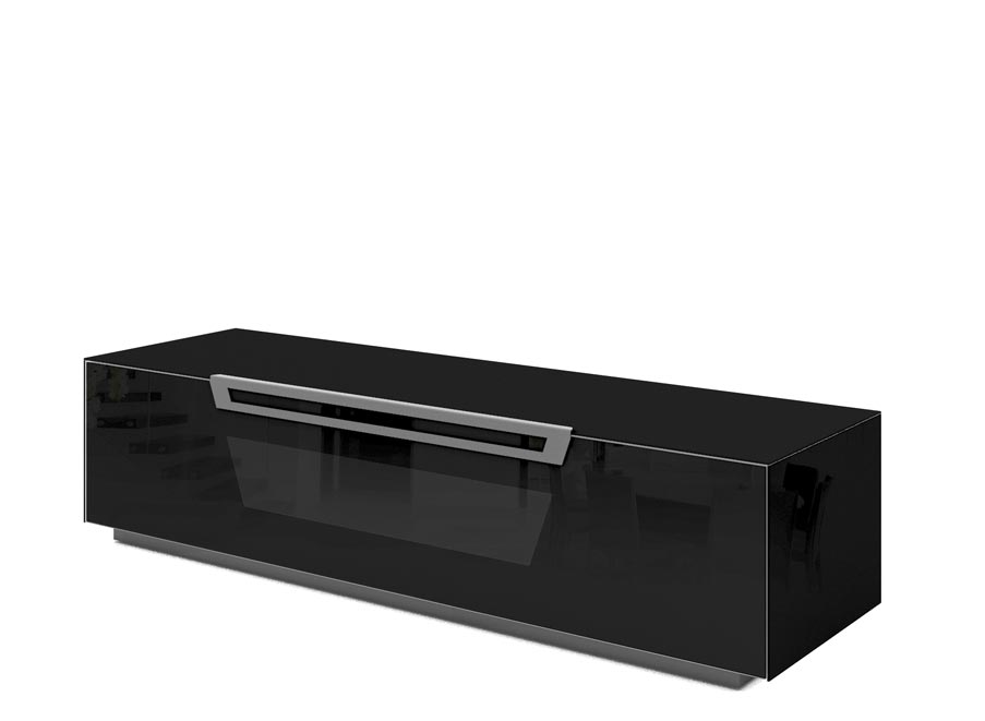 Eleganter TV-Schrank mit raffiniertem Design. Seine essentielle Linie mit kaum angedeuteten Profilen harmonisiert die Essenz des zentralen Motivs, das von der besonderen Form des Griffs ausgeht und sich in einem angedeuteten Design auf der Glasfront fortsetzt.