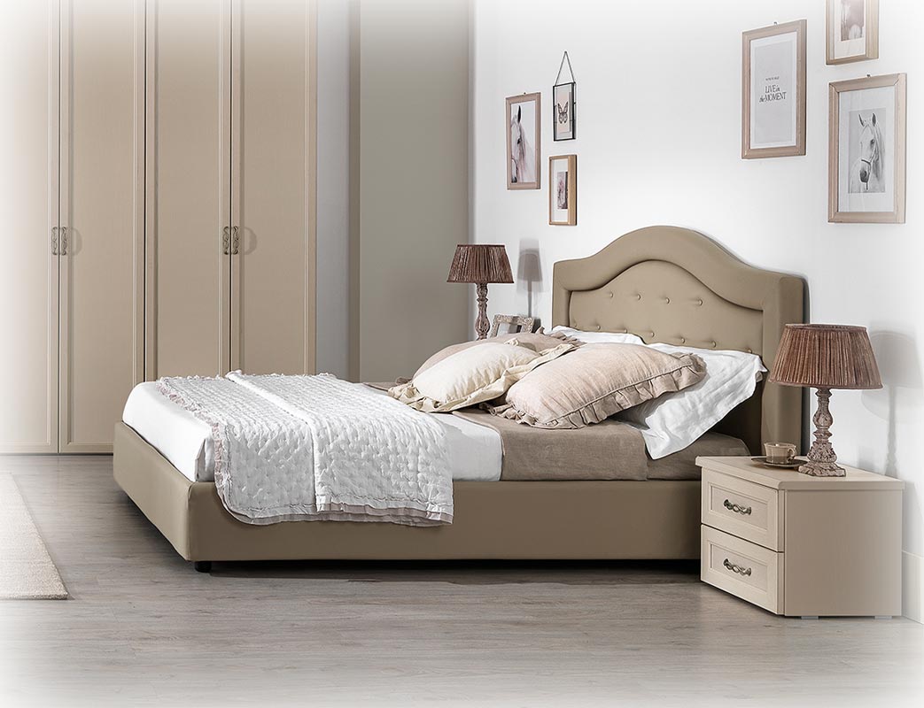 Ein elegantes Bett voller Charme, das sich durch ein großes, umhüllendes Kopfteil mit weichem Mikrofaserbezug auszeichnet. Es ist mit dem Capitonné-Effekt versehen, um ihm ein leichteres Aussehen zu verleihen.