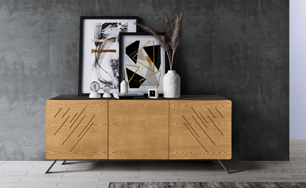 Sideboard im zeitgenössischen Stil, das die warme Eschenholzfarbe der Türen mit der modernen Anthrazitfarbe des Korpus kombiniert.