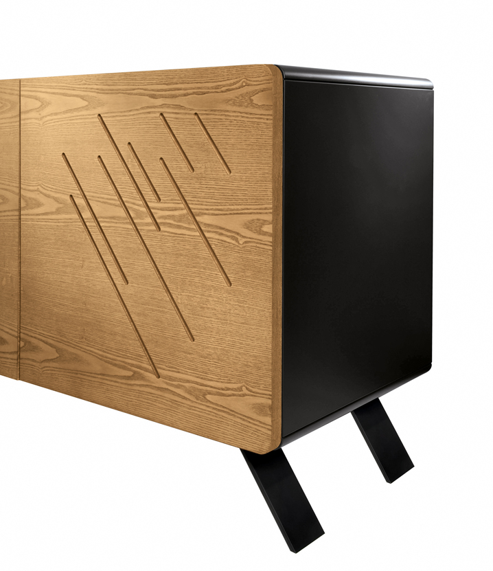 Ein eleganter Kompromiss zwischen Modernität und Klassik: Die Geometrie der Metallbeine vermischt sich mit der Linearität der Struktur.