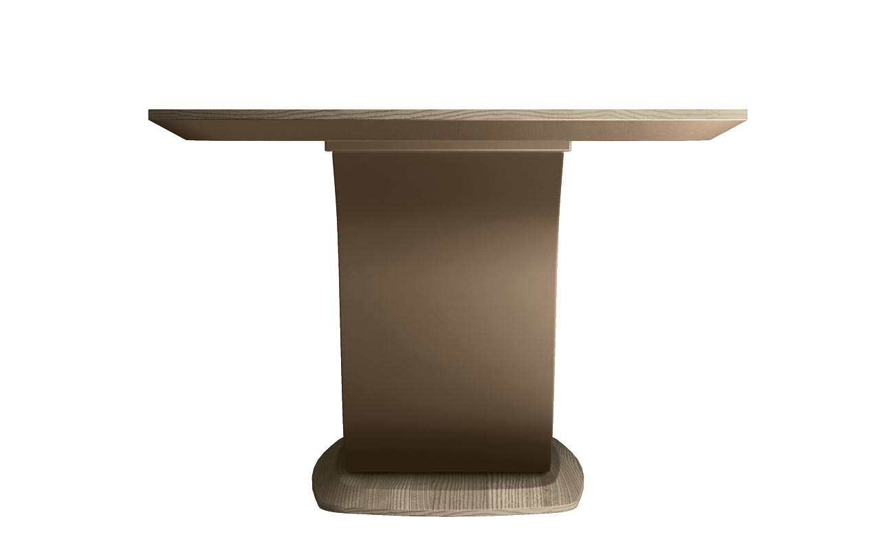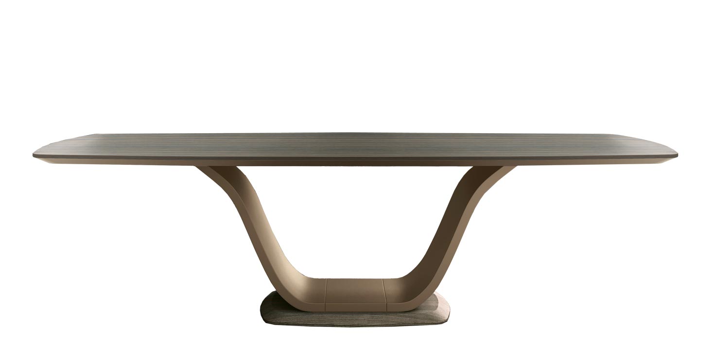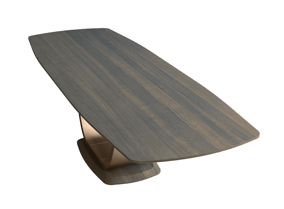 Die gewundene Form des Fußes bildet einen eleganten Kontrast zur rechteckigen, leicht abgeschrägten Tischplatte.