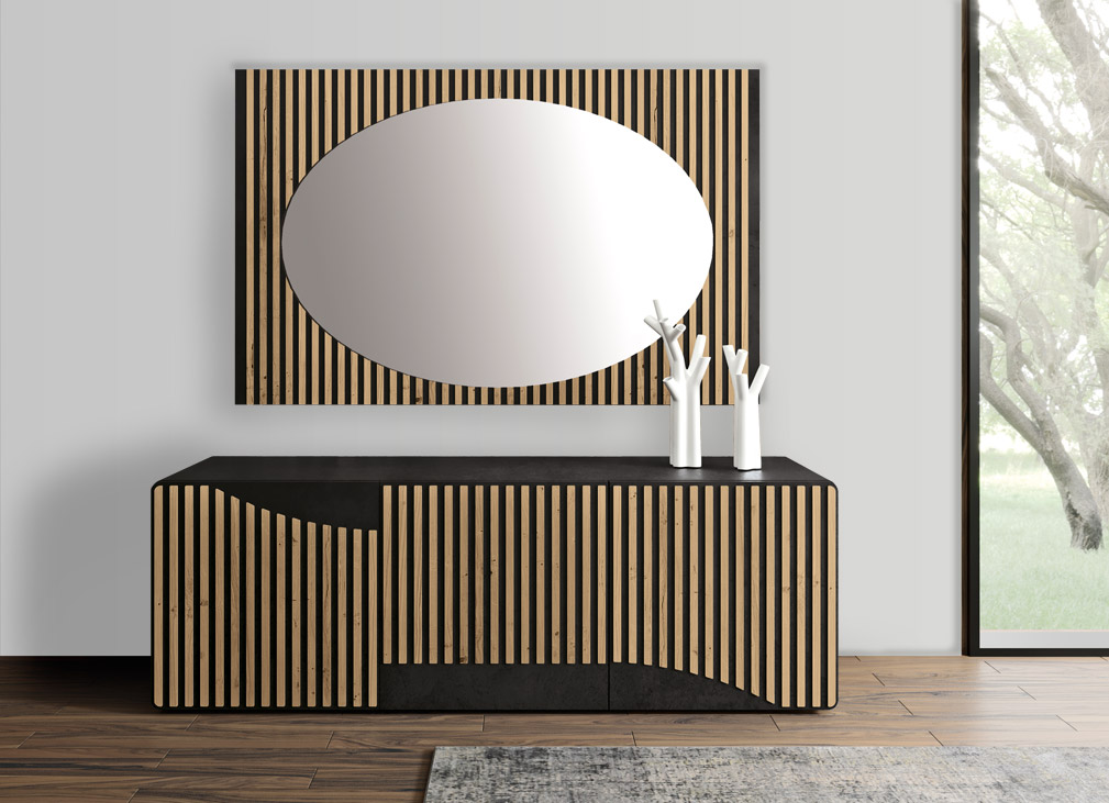 Perfekte Kombination für eine Wand in Ihrem Wohnbereich: Sideboard mit Eichenleisten passend zum Spiegel.