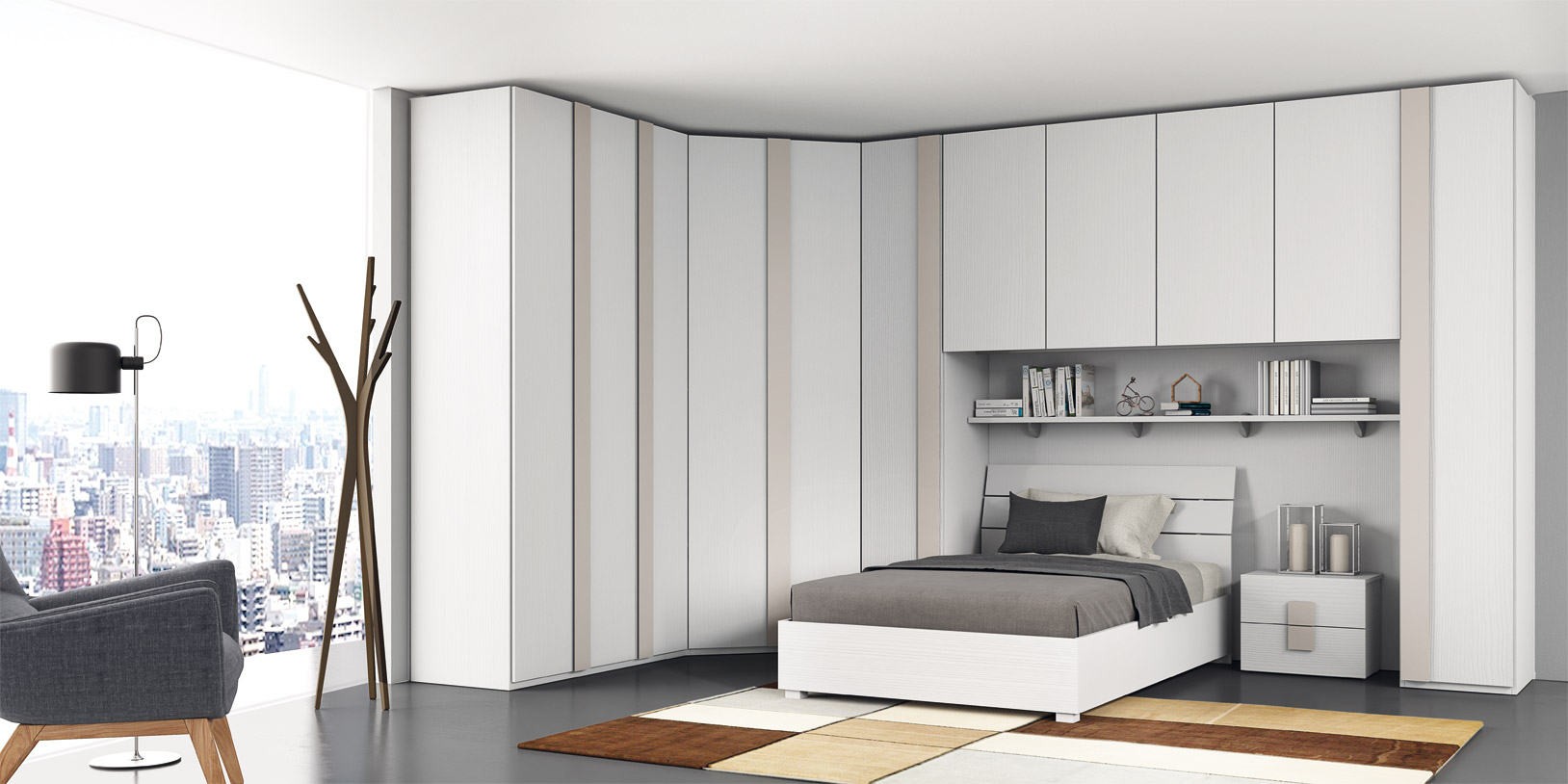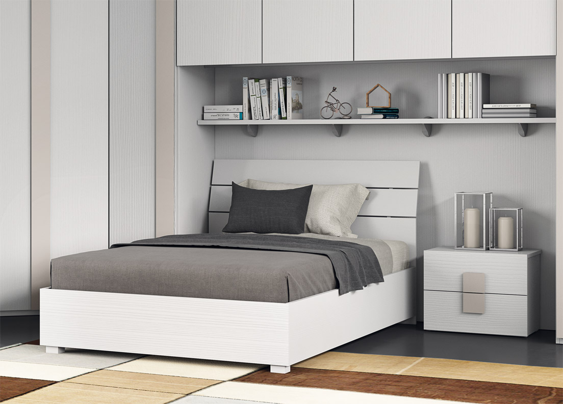 Bestehend aus: Eck-Kleiderschrank mit Brücke, Regal, Nachttisch mit zwei Schubladen, 120 cm Bett mit Stauraum. Abgebildet in weißer und taubengrauer Lärchenholzausführung.