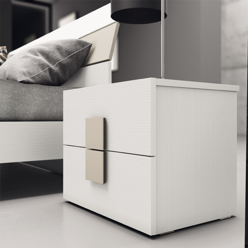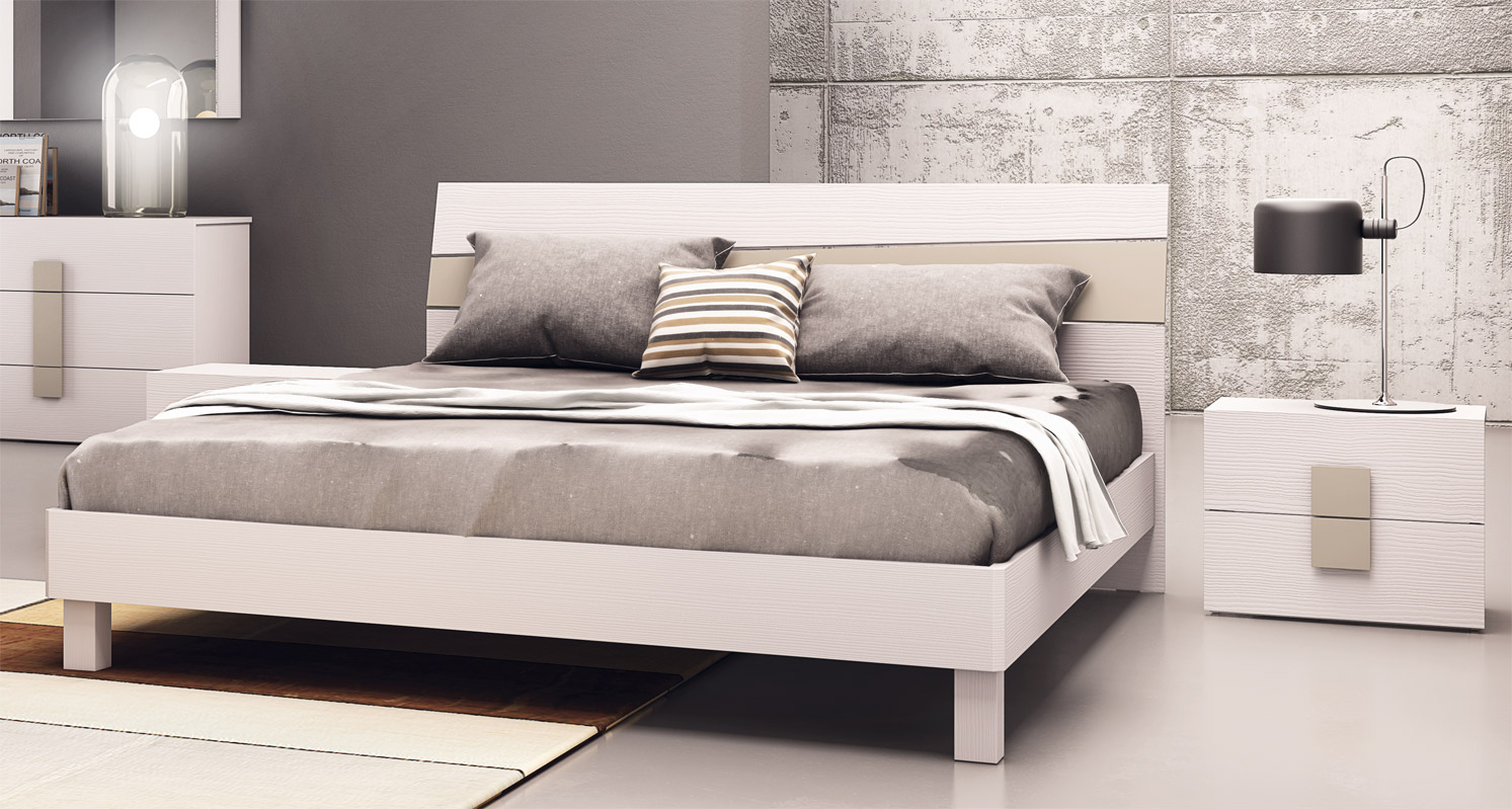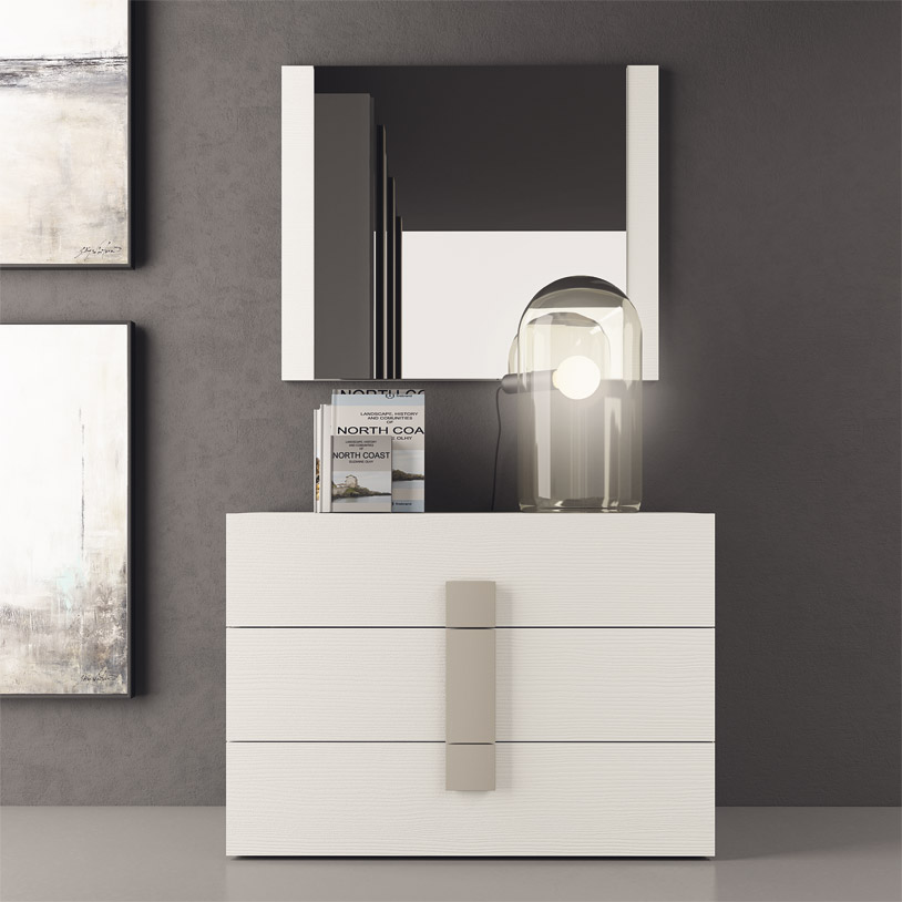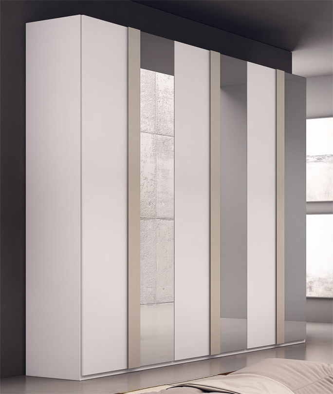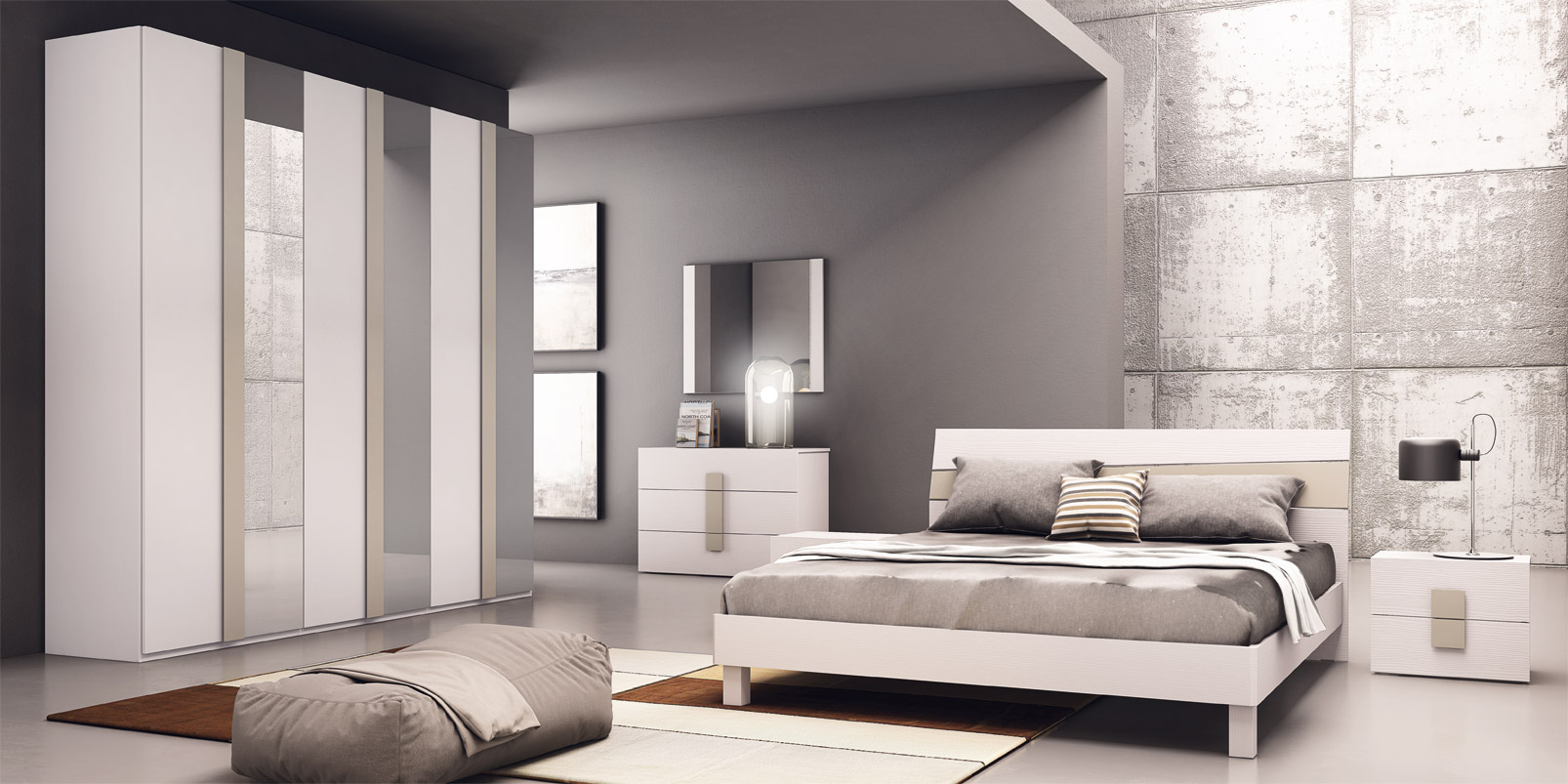 Bestehend aus: Kleiderschrank mit sechs Flügeltüren und Spiegeln, Kommode mit drei Schubladen, 2 Nachttischen mit zwei Schubladen, Bett und Spiegel. Hier in weißer und taubengrauer Lärchendekoration abgebildet.