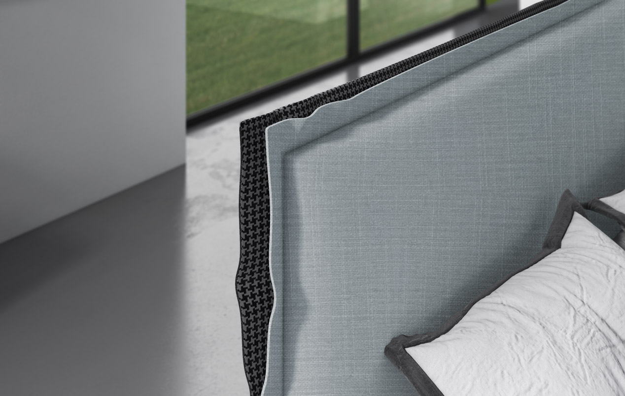 Bestehend aus: Kleiderschrank mit 2 Schiebetüren, Kommode mit vier Schubladen, 2 Nachttische mit zwei Schubladen, gepolstertes Bett und Spiegel. Hier abgebildet in Dunkelgrau, Kreidescheibe und Steinoptik.