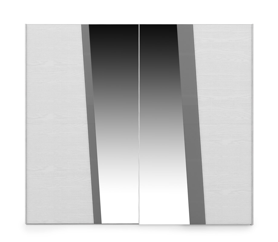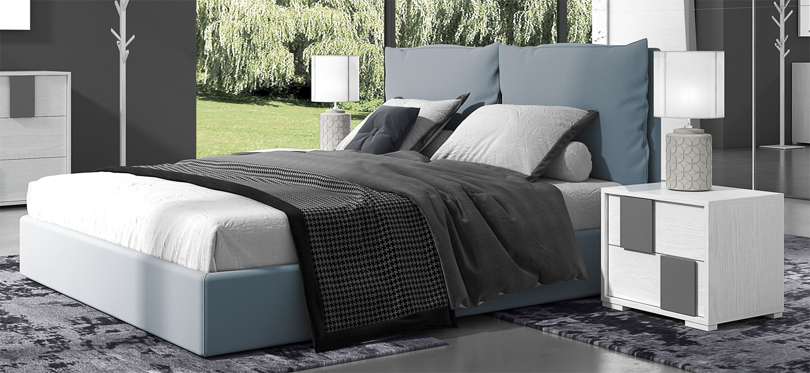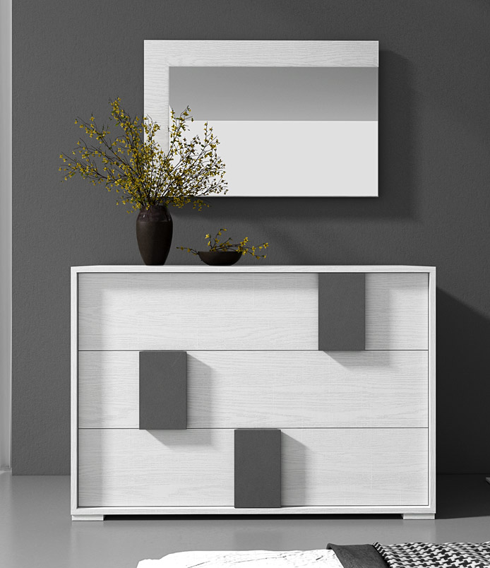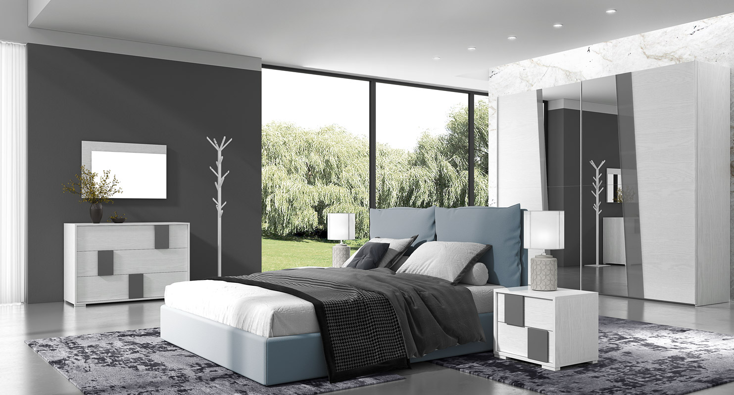 Bestehend aus: Kleiderschrank mit 2 Schiebetüren und Spiegel, Kommode mit drei Schubladen, 2 Nachttische mit zwei Schubladen, gepolstertes Bett und Spiegel. Hier in der Farbe Steine und Kreidescheibe präsentiert.