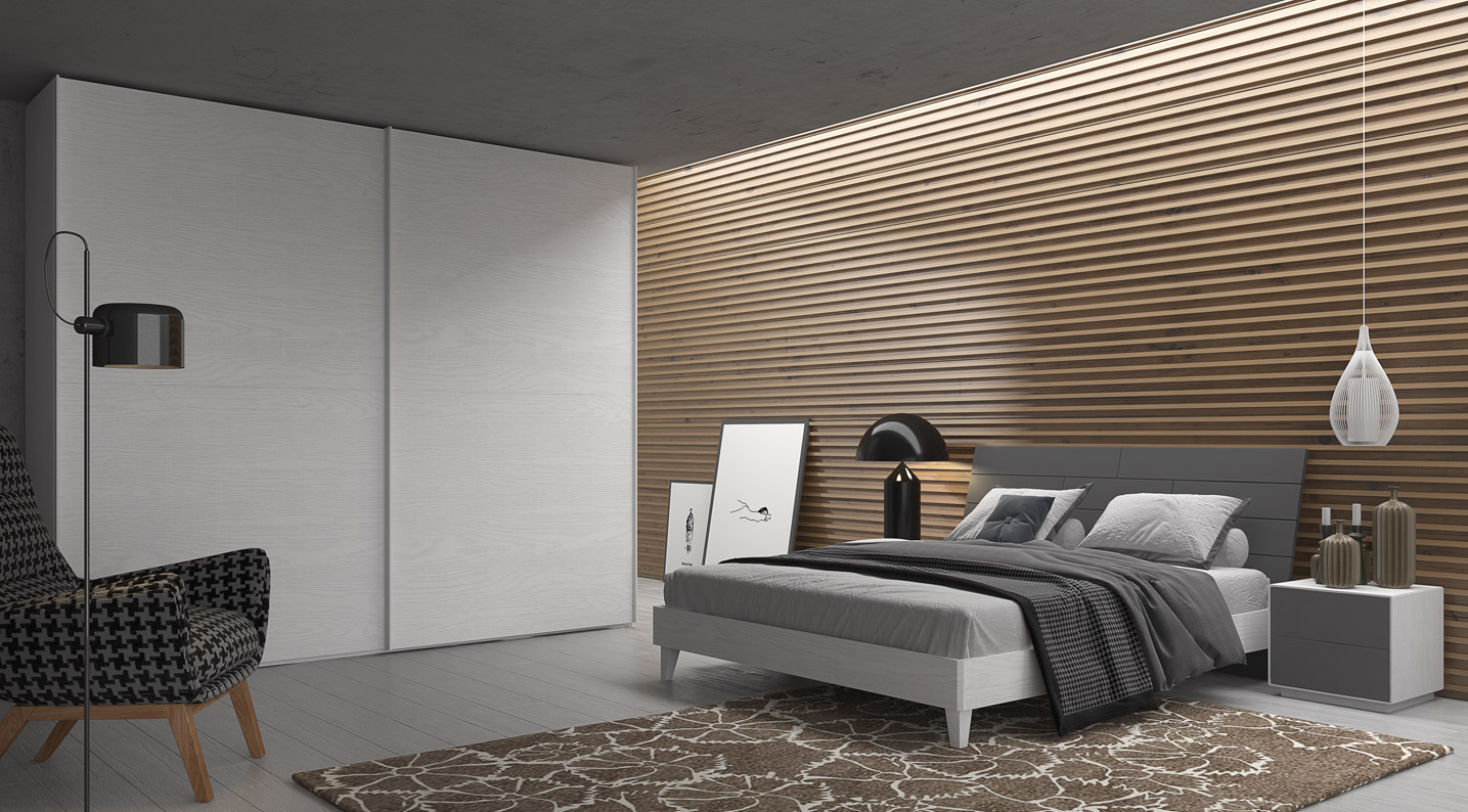 Bestehend aus: Kleiderschrank mit 2 Schiebetüren, 2 Nachttischen mit zwei Schubladen und Bett. Hier abgebildet in Dunkelgrau und Kreidescheibe Farbe