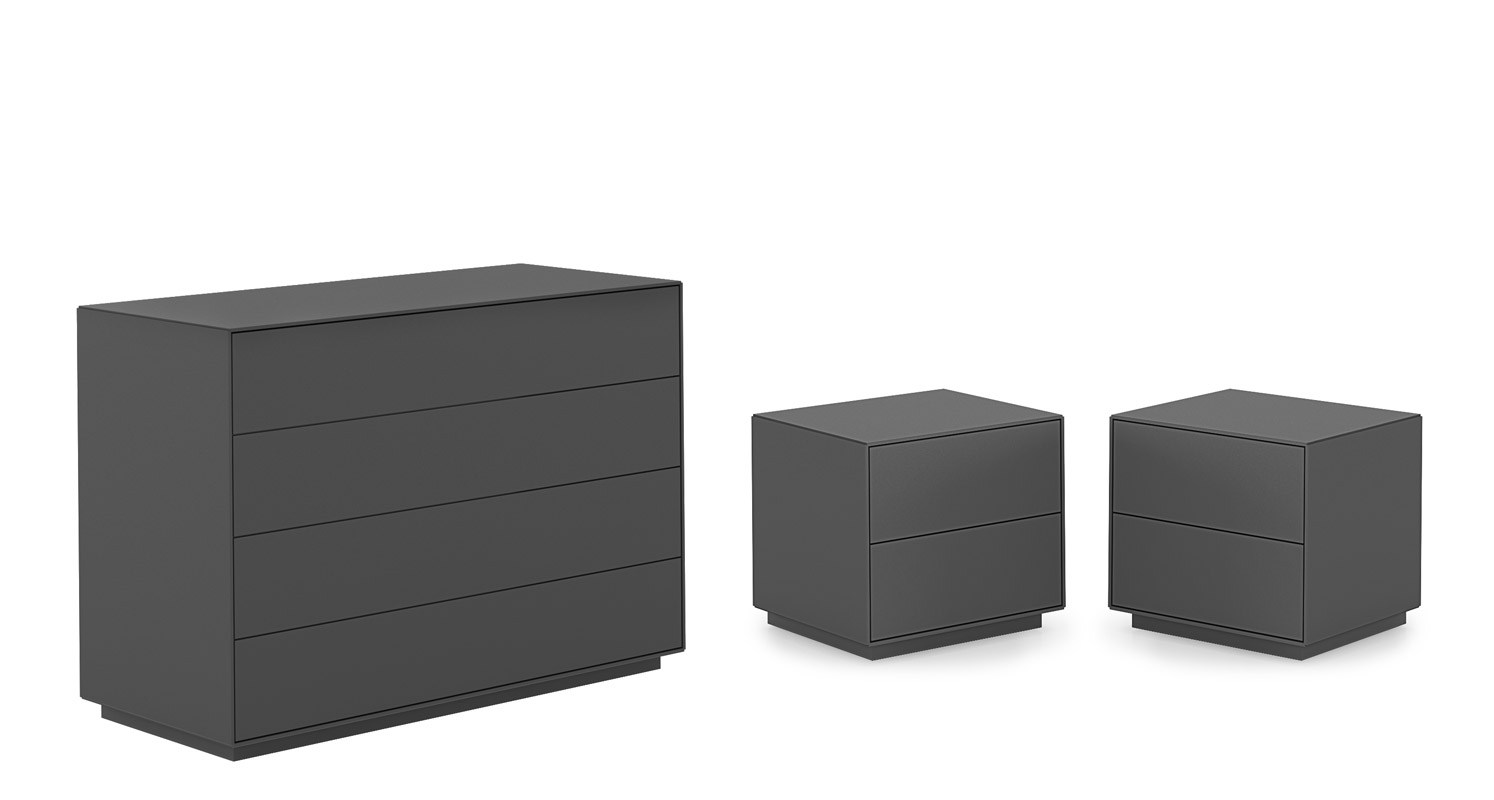 Möbelgruppe für einen modernen und minimalistischen Schlafbereich.