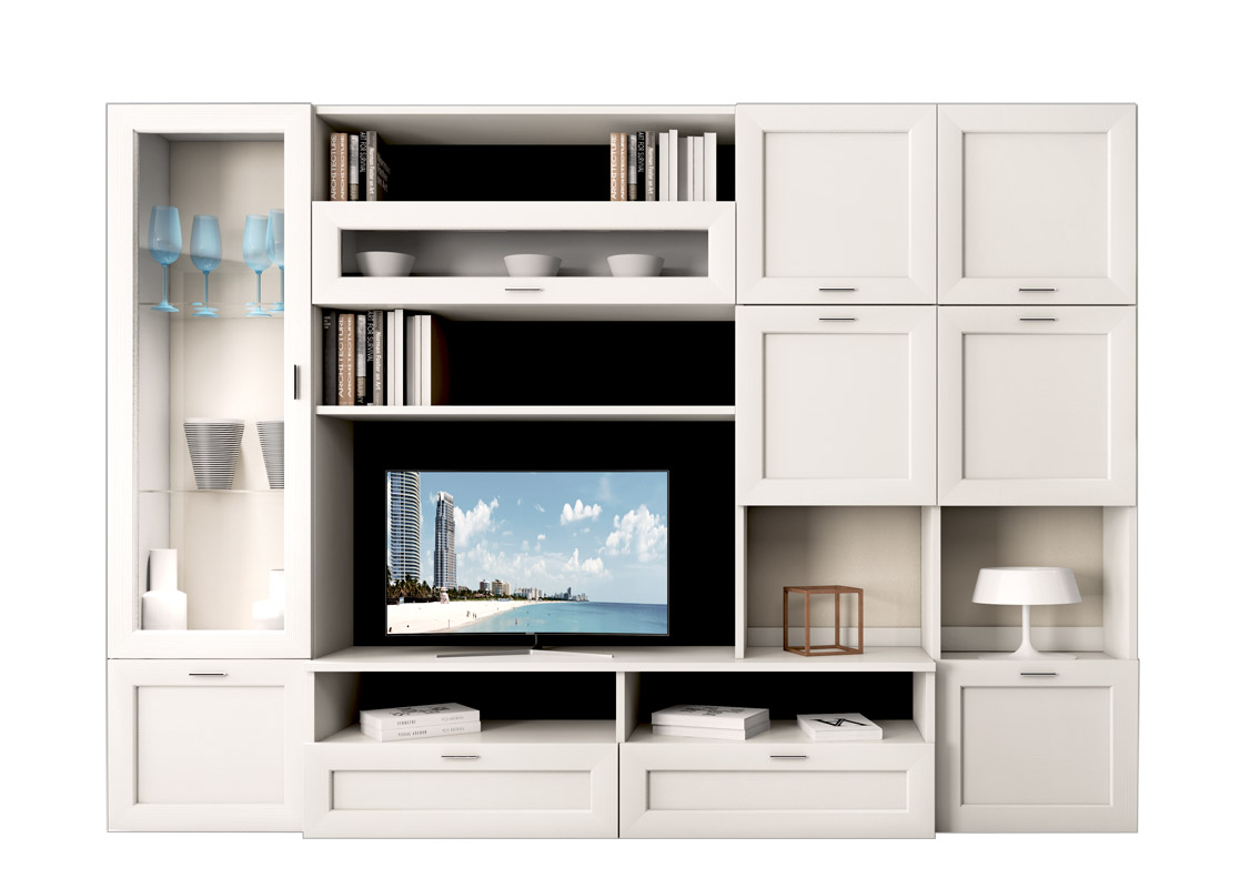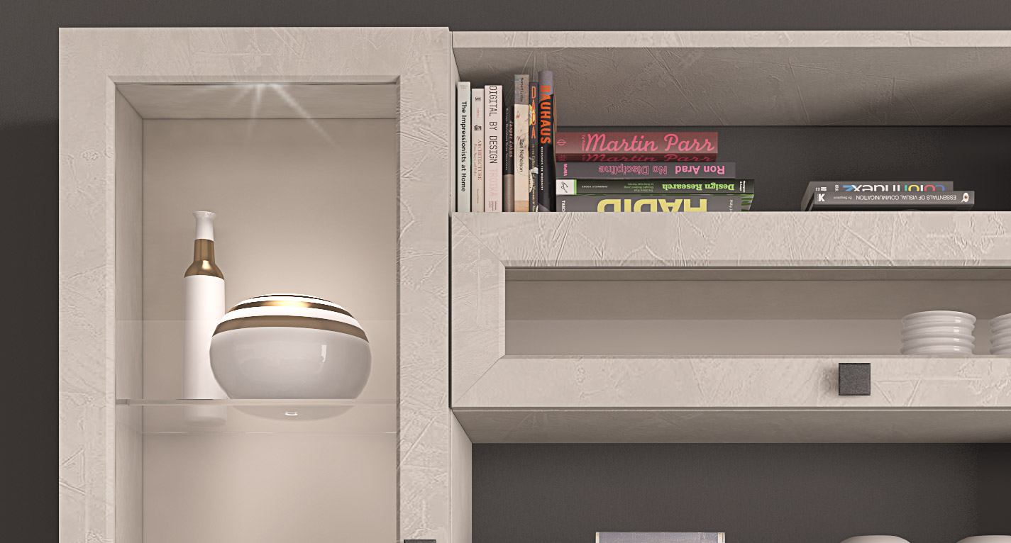 Die verschiedenen Fächer wechseln zwischen Türen mit sanftem Öffnungs- und Schließmechanismus und offenen Räumen, in denen Sie Ihre wertvollsten Gegenstände und Dinge ordentlich aufbewahren können.