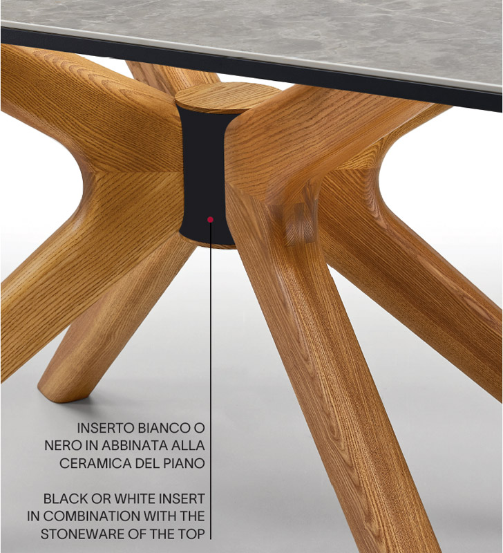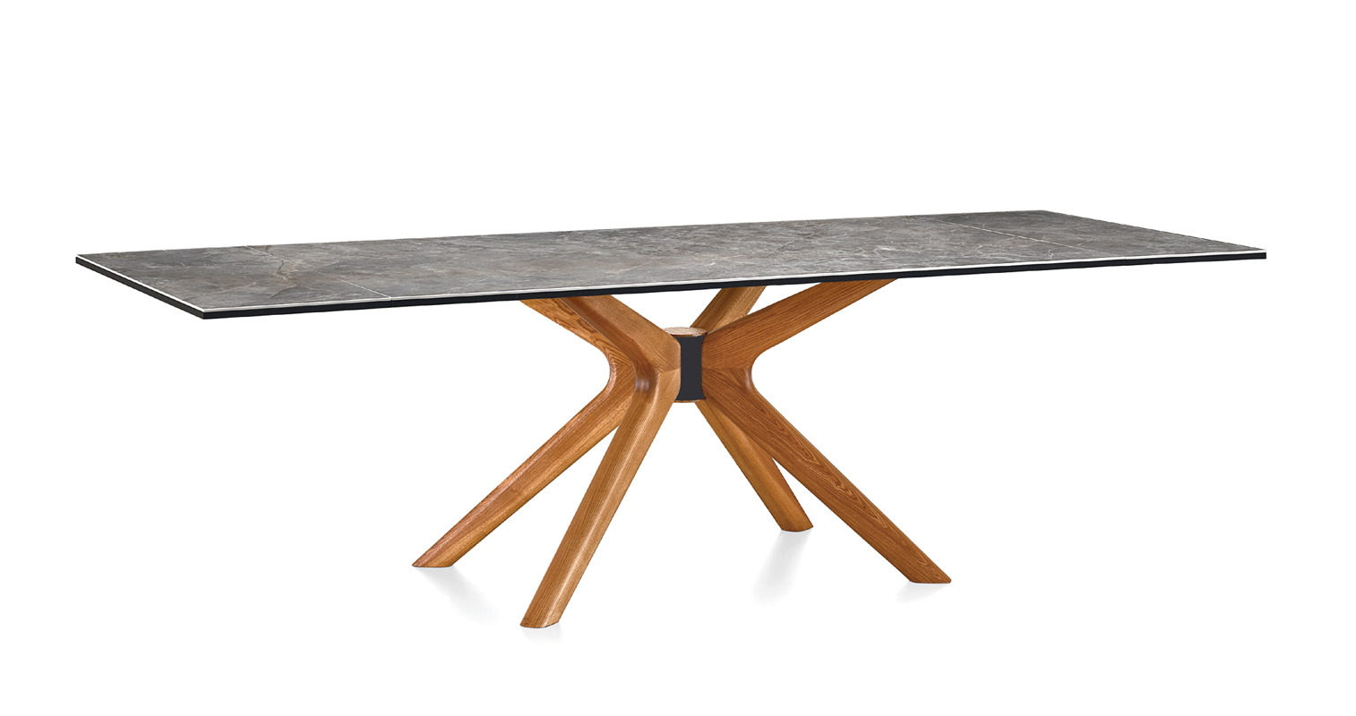 Ein Tisch von Natisa, der den modernen Stil seiner Keramikplatte mit dem Klassizismus des für den Sockel verwendeten Holzes verbindet.
