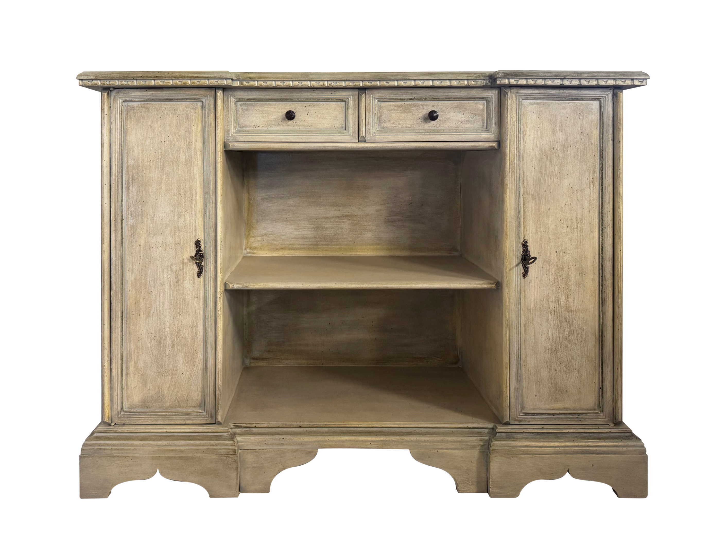 Zwei Türen an den Seiten, zwei zentrale Schubladen unter der Platte und ein großes offenes Fach mit Einlegeboden bieten Stauraum und Funktionalität für dieses handgefertigte Meisterwerk.
