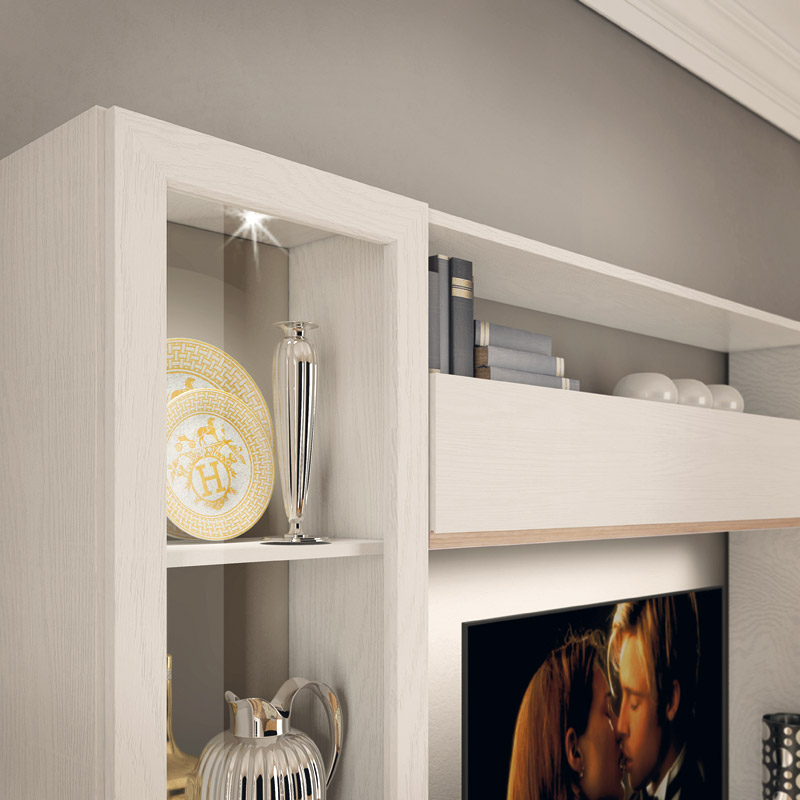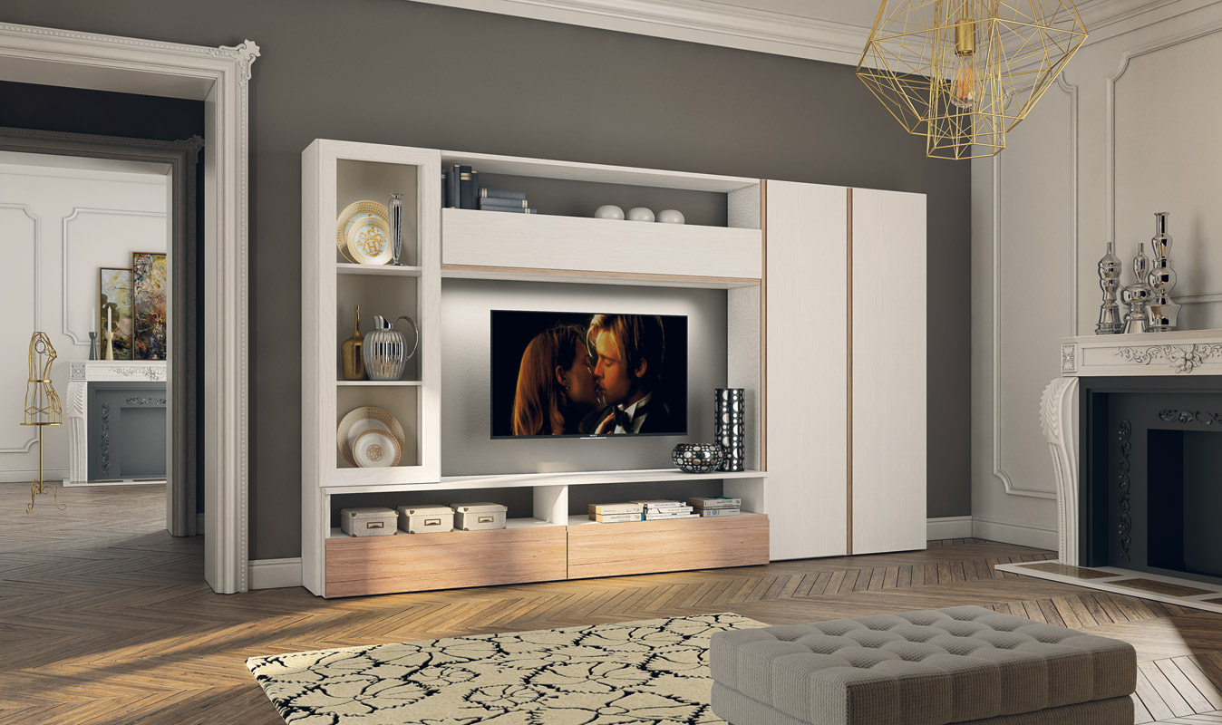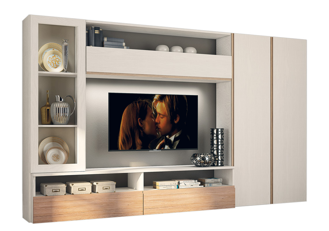 Perfekt für die Einrichtung einer Wand in Ihrem Wohnbereich, bietet diese Komposition: einen TV-Platz, durch Klappen verschließbare Fächer, eine Vitrine und einen Seitenschrank mit höhenverstellbaren Innenregalen.