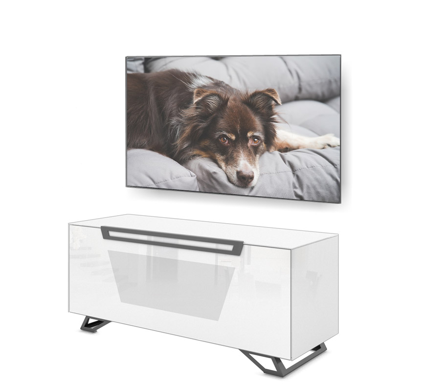 Die Besonderheit dieses TV-Schranks ist das "Active door"-System, das die Eingabe einer beliebigen Fernbedienung auch bei vollständig geschlossener Tür ermöglicht.