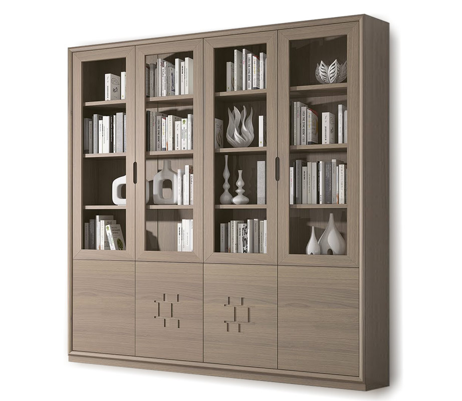 Großes 4-türiges Bücherregal im zeitgenössischen Stil. Struktur aus massivem Eschenholz, gekennzeichnet durch frische, klare Linien und originelle Details wie die geometrischen Schnitzereien in den Holztüren und die Fräsungen der Griffe in den Glastüren.
