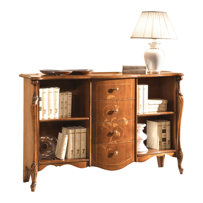 Die Struktur ist sehr stark und gut bearbeitet. Der Sockel und die Platte sind aus Massiv Toulipier, die andere Teilen sind aus MDF Paneel, die durch Tanganjika Nussbaum und Buchenholz plattiert werden.