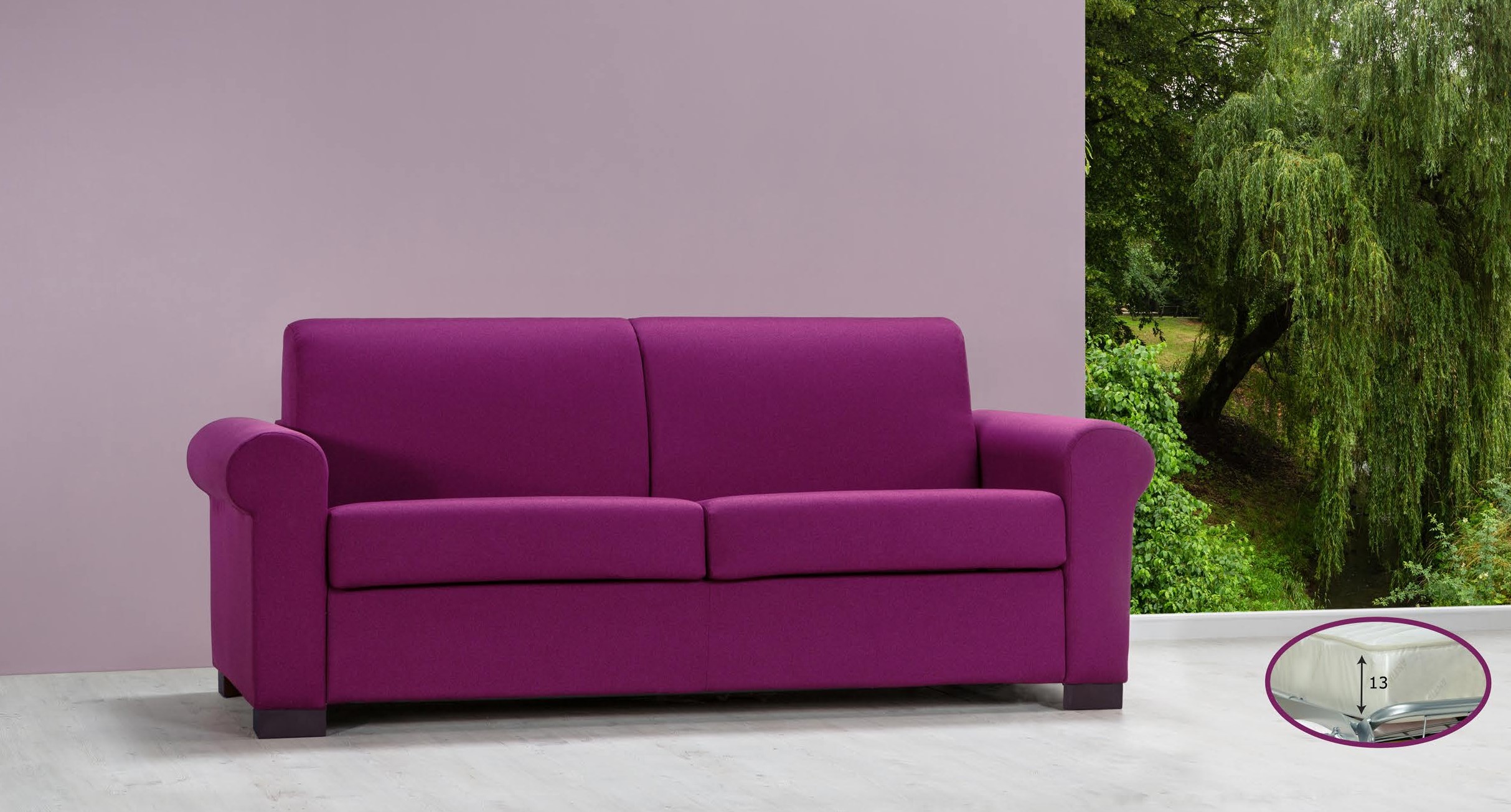 Violettes Sofa mit abnehmbarem Bezug mit starkem Holzrahmen und interner Aufhängung mit hochfesten elastischen Gurten. Sitz und Rückenlehne aus hochdichtem Polyurethanschaum für maximalen Komfort. Inklusive elektrogeschweißtem Federkern und einer Schaumstoffmatratze 100x190x13 cm. Komplett mit praktischem Kissenfach für ein optimales Raummanagement. Die ideale Wahl, um Komfort, Funktionalität und Eleganz in einem einzigen Möbelstück zu vereinen!