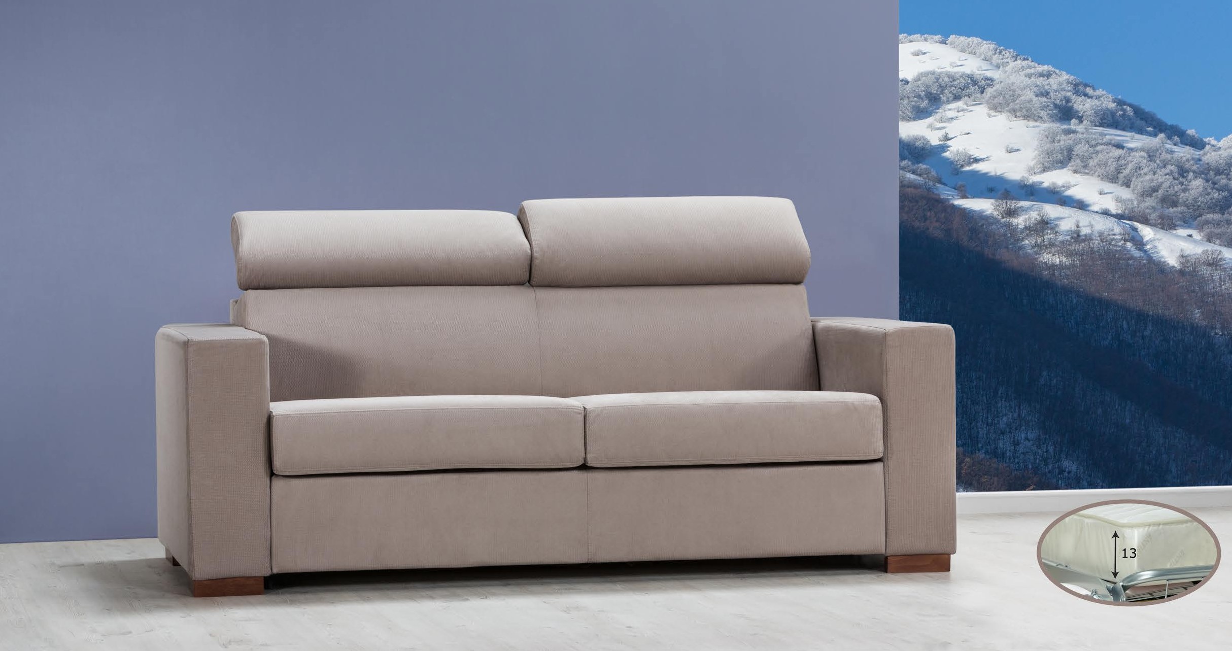 Ein praktisches und bequemes Schlafsofa, ideal für alle, die vielseitige und funktionelle Einrichtungsgegenstände suchen. Es besteht aus einem Holzrahmen und ist mit einer Innenfederung mit hochfesten elastischen Bändern und einer Polsterung aus hochdichtem Polyurethanschaum ausgestattet. Das Bett ist mit einer elektrogeschweißten Federung und einer erweiterten Matratze (100x190 cm, Höhe 13 cm) ausgestattet, die einen hochwertigen Schlaf garantieren. Die Vertiefung für den Kopfkissenhalter bietet zusätzlichen Komfort.