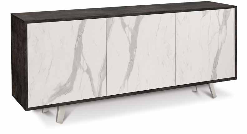 Stellen Sie sich ein Kunstwerk vor, das die ursprüngliche Kraft der Erde und die ätherische Reinheit des Marmors verkörpert. Unser 3-türiges Sideboard ist genau das: ein Zusammentreffen der Intensität von schwarzem Oxid und der leuchtenden Raffinesse von Calacatta-Marmor-Imitat.