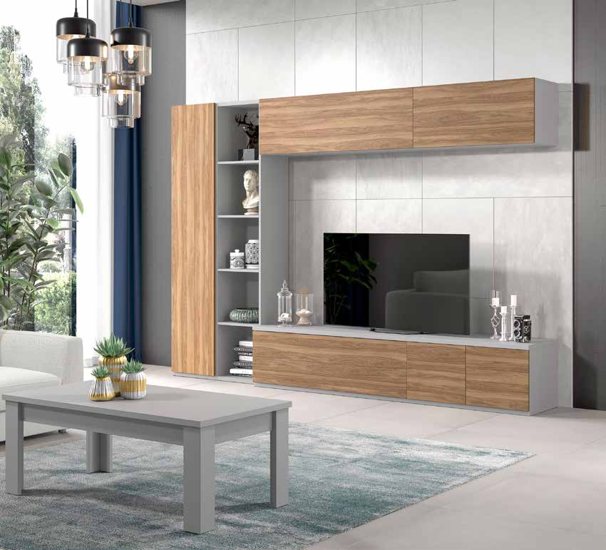 Fangen Sie die Essenz der modernen Eleganz mit diesem Wohnzimmermöbel ein, das Funktionalität und Stil harmonisch vereint. Der perlgraue Rahmen bietet eine neutrale und raffinierte Oberfläche, während die Fronten aus Walnussholz einen Hauch von Wärme und Natürlichkeit verleihen und einen optisch ansprechenden Kontrast bilden.