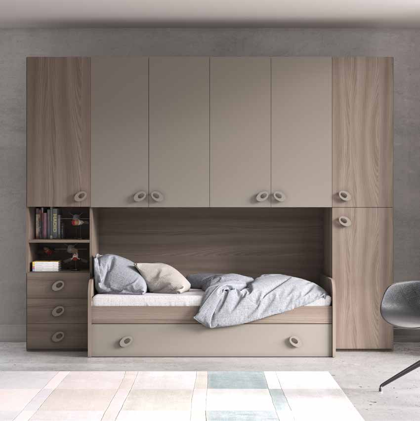 Raum und Stil treffen sich in unserem Bridge-Schlafzimmer, einer Oase der Funktionalität und des Designs. Sieben geräumige Türen, drei Nachttische mit Schubladen, ein kleines offenes Fach, zwei Betten (eines davon mit Lattenrost für eine erholsame Nachtruhe, das andere mit einem bequemen Lattenrost, der bei Bedarf ausgezogen werden kann). Die Struktur aus weißer Esche, warm und hell, passt zu den Tür- und Schubladenfronten in einer zarten Farbpalette und schafft ein harmonisches und raffiniertes Ambiente. Ein Ort, an dem Ordnung auf Schönheit trifft, an dem jedes Detail dazu dient, das Leben Ihres Kindes schöner und ruhiger zu machen.