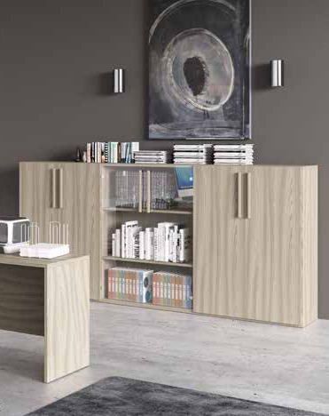 Praktischer Modulschrank mit 6 Türen H125 cm, mit zwei zentralen Glastüren. Minimaler Stil und einfache Linien für ein Möbelstück, das im Büro, im Arbeitszimmer, im Flur oder in jedem anderen Raum aufgestellt werden kann, in dem man Dinge ordentlich aufbewahren und gleichzeitig einen Hauch von Design vermitteln möchte.
