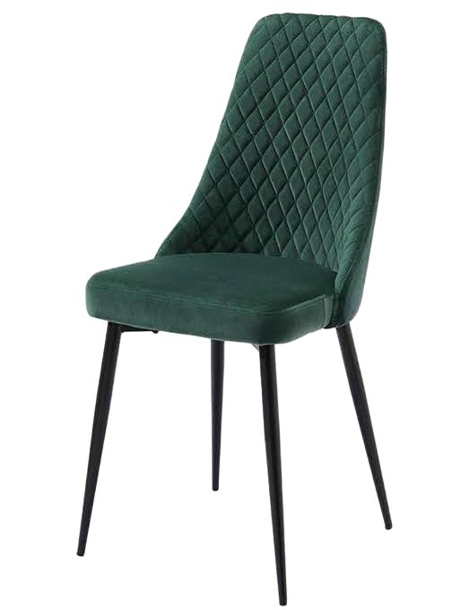 Ein Design-Stuhl mit einer schmalen, nach oben gestreckten Silhouette, einem soliden Rahmen und Eisenbeinen. Sitzfläche und Rückenlehne aus Samt, letztere mit Steppeffekt, im Farbton Grün für einen Hauch von Stil, Originalität und Farbe in der Umgebung, in der der Stuhl aufgestellt wird.