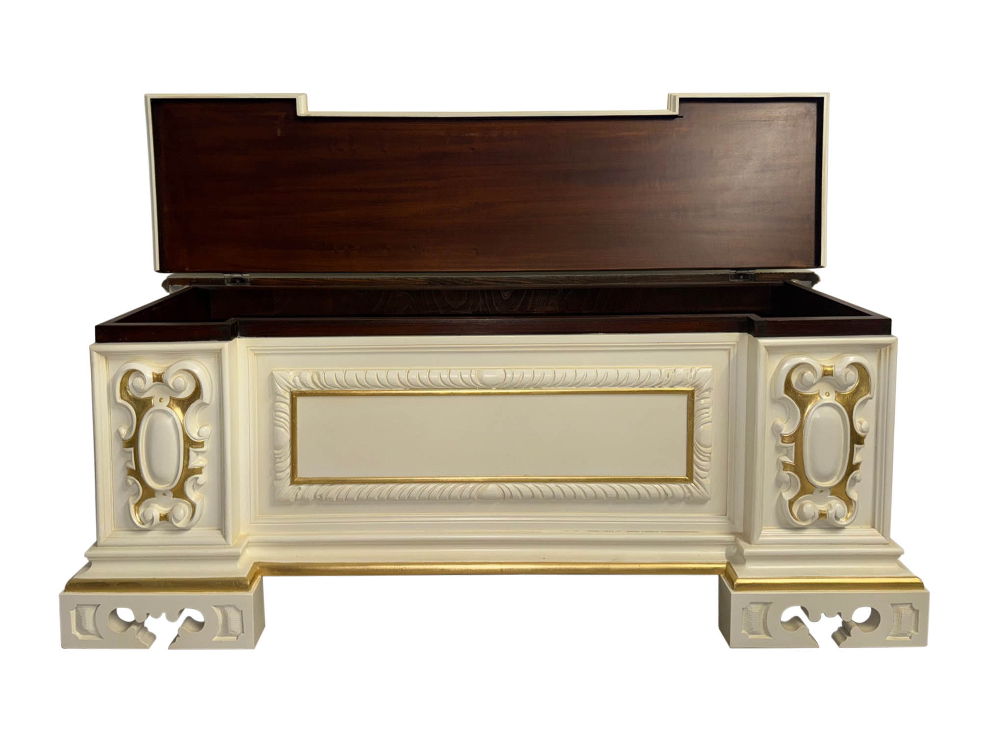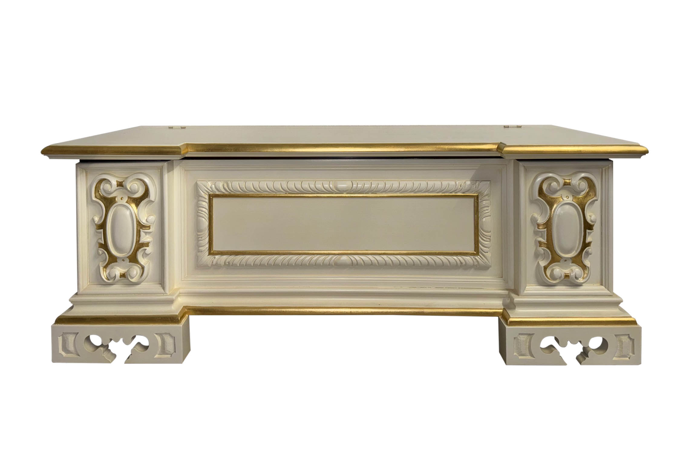 Die zahlreichen Schnitzereien, die das Ergebnis der sorgfältigen Arbeit der venezianischen Tischler sind, werden durch den elfenbeinfarbenen Lack hervorgehoben, der mit zartem Blattgold verziert ist.