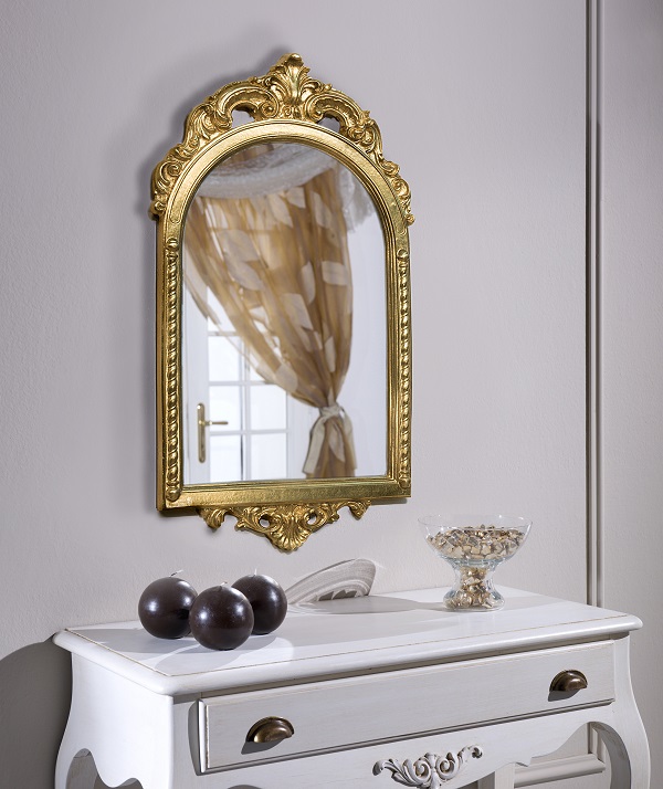 Spiegel mit klassischer, aber origineller Linie, mit einer schönen handwerklichen Verzierung auf der Oberseite, die sich auch auf der Unterseite wiederfindet, und einer schönen Verarbeitung der Schultern, die fast an den Eingang eines Tempels erinnert.