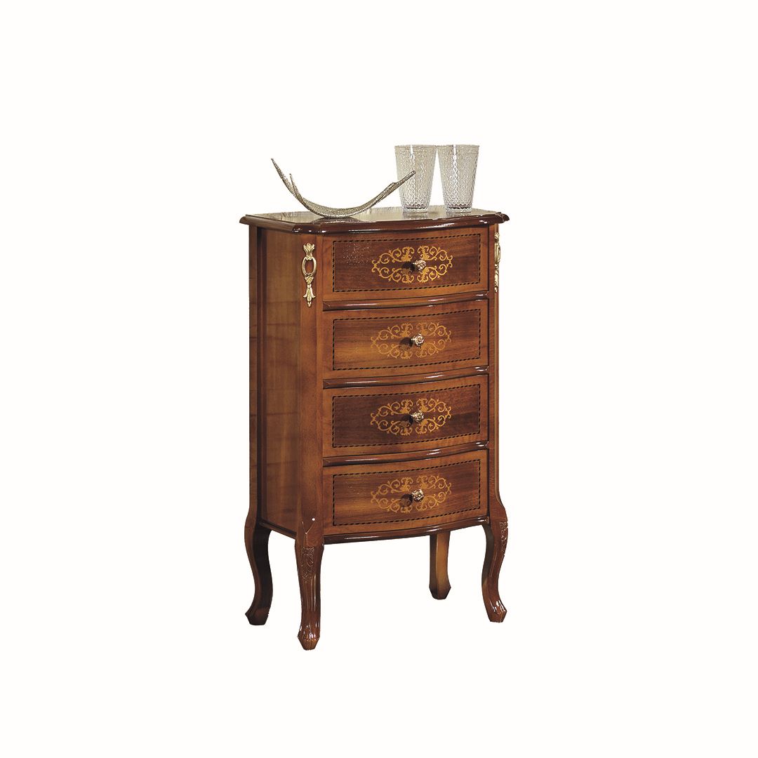 Wunderschöner Nachttisch im klassischen Stil mit 4 geräumigen Schubladen, deren Fronten mit eleganten Intarsien verziert sind.