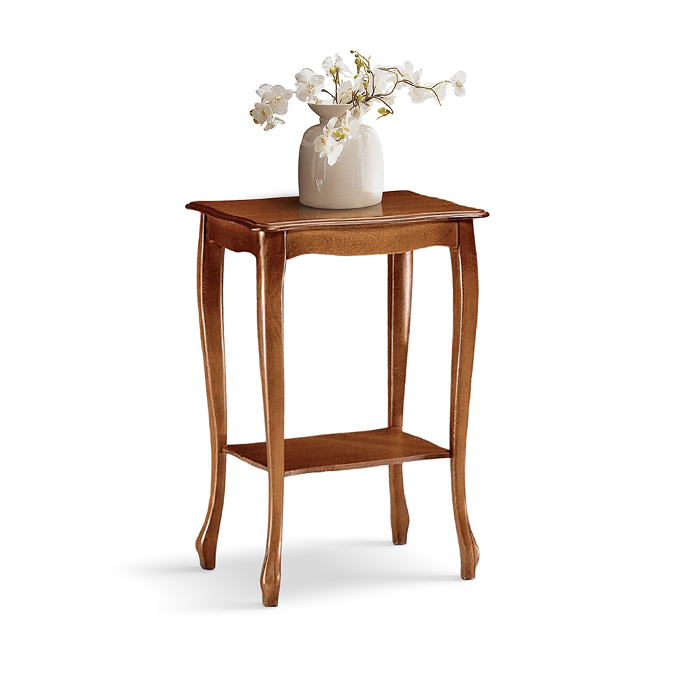 Ein schöner Beistelltisch im klassischen Stil mit eleganter und schlanker Linie, der trotz seiner kompakten Abmessungen dennoch Ablagefläche auf der oberen und unteren Ebene bietet.