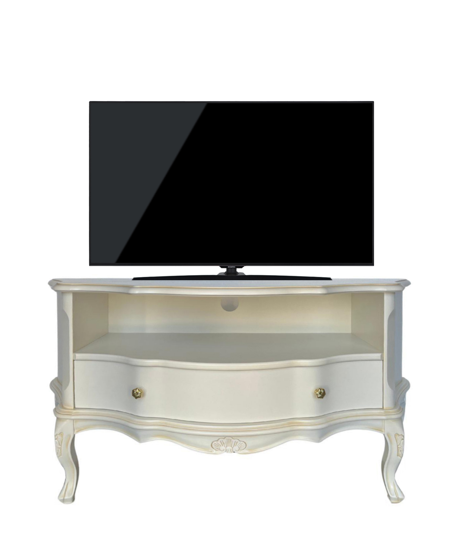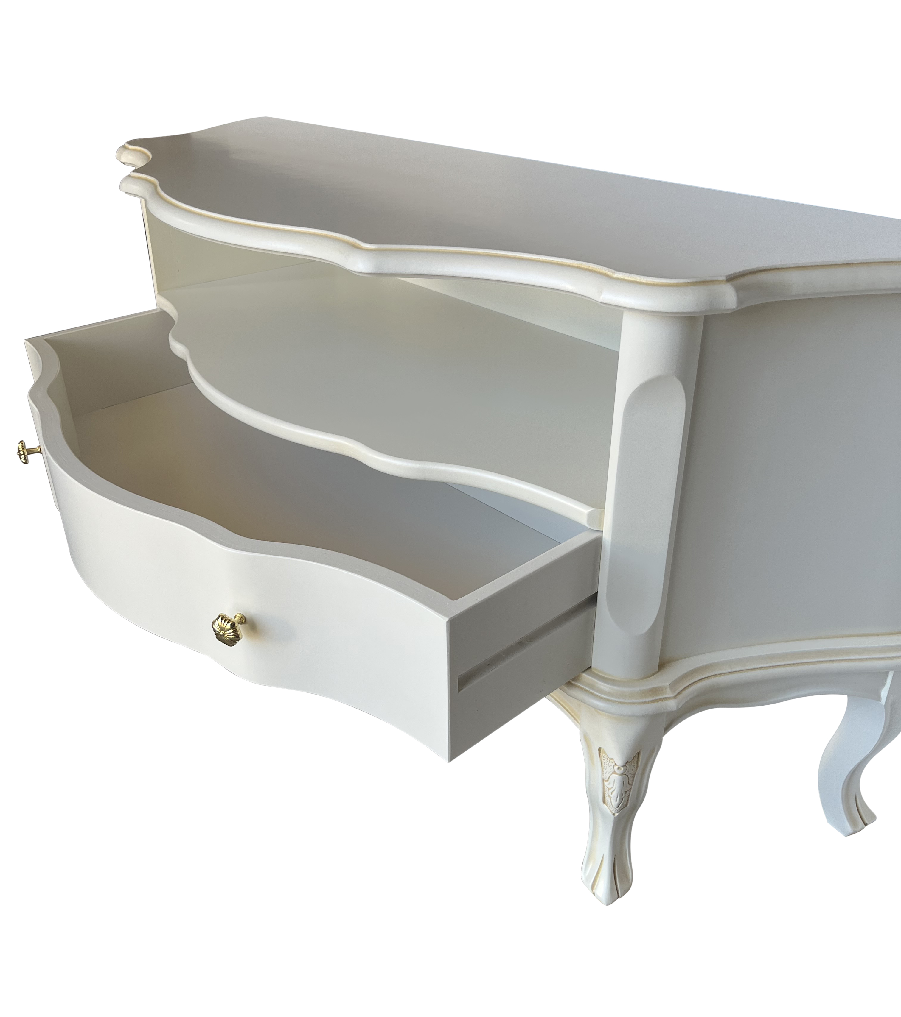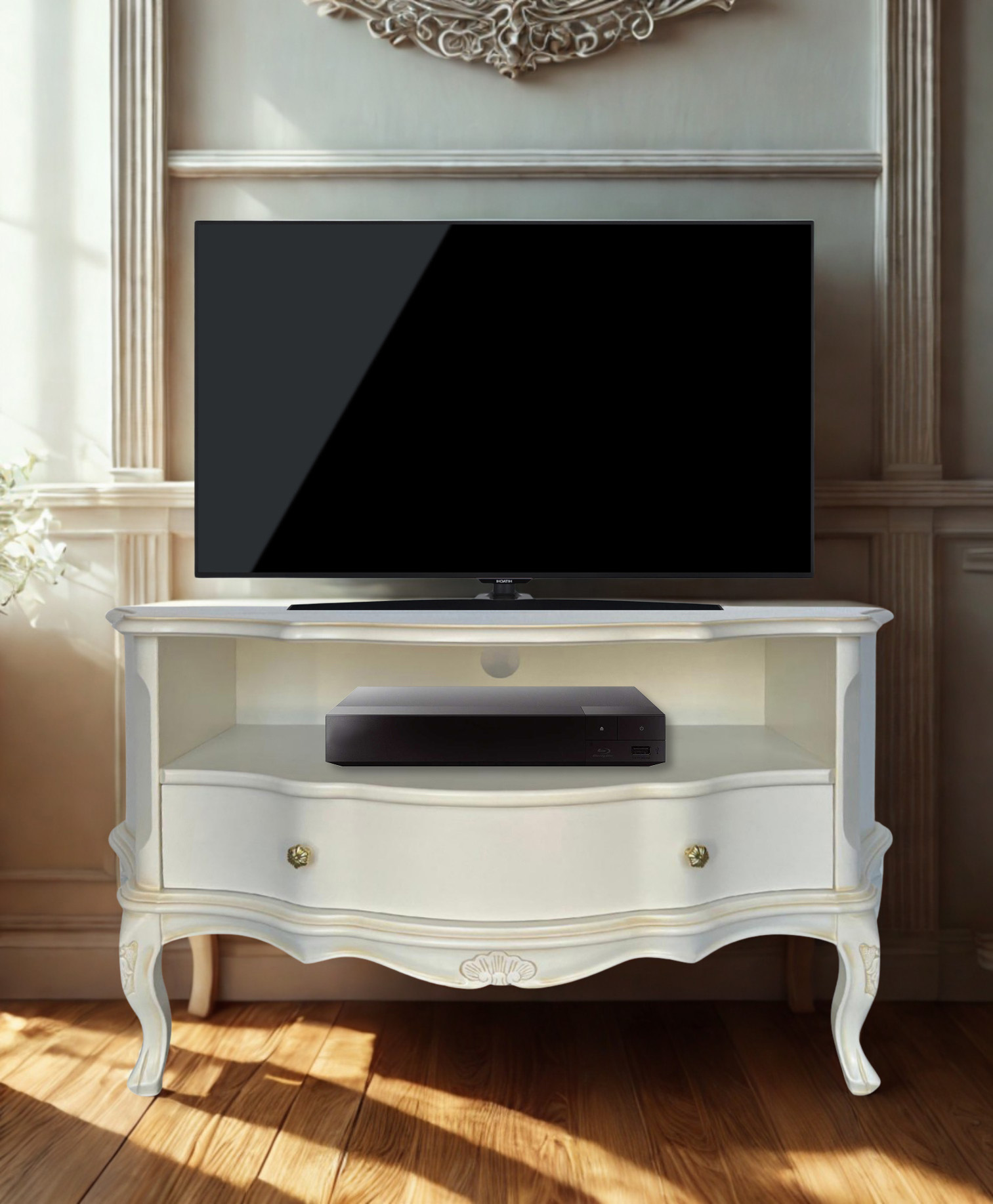 Wunderschöner TV-Schrank im klassischen Stil, der durch eine schöne lackierte Patina-Farbe hervorgehoben wird, um seine geschwungenen Linien zu betonen.
